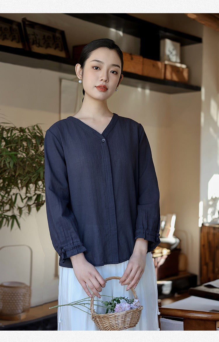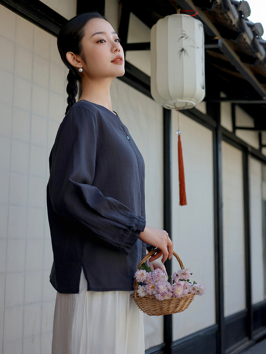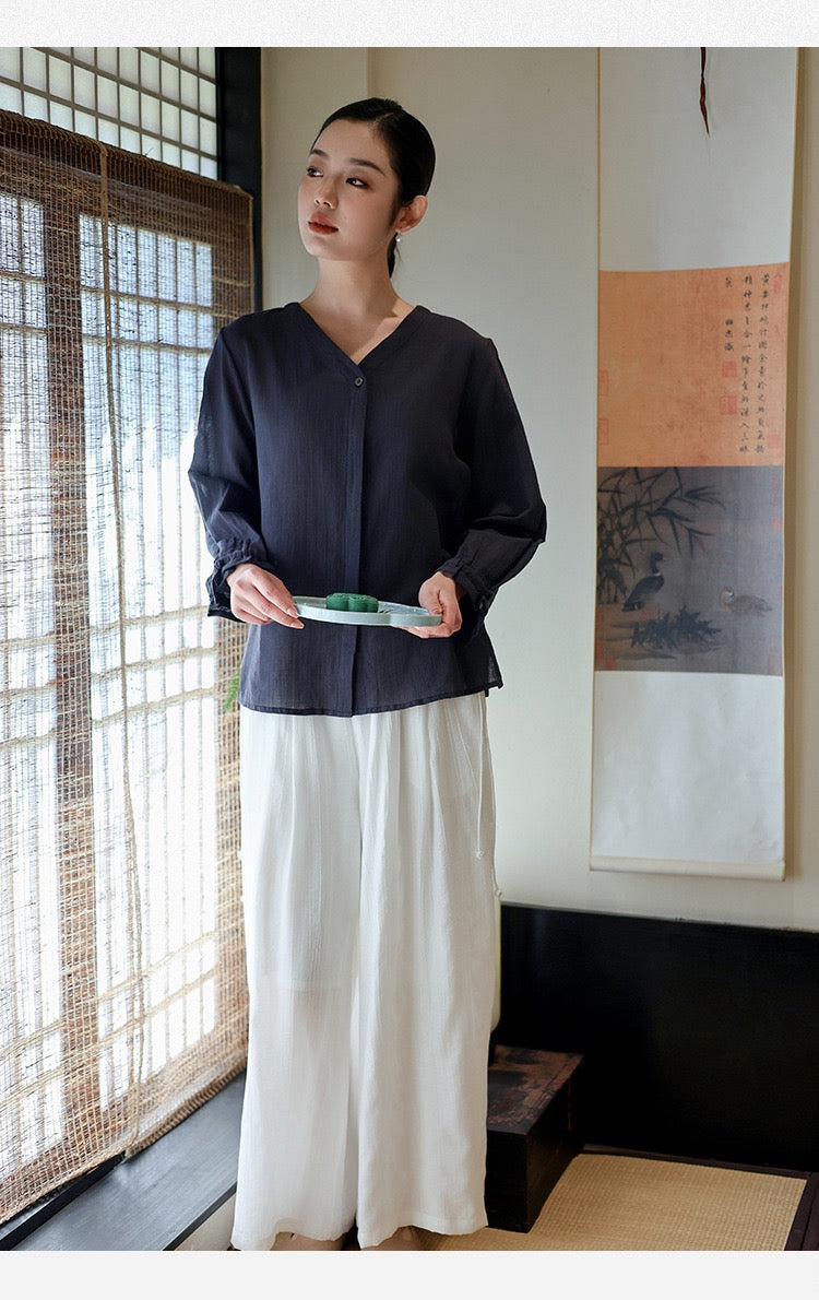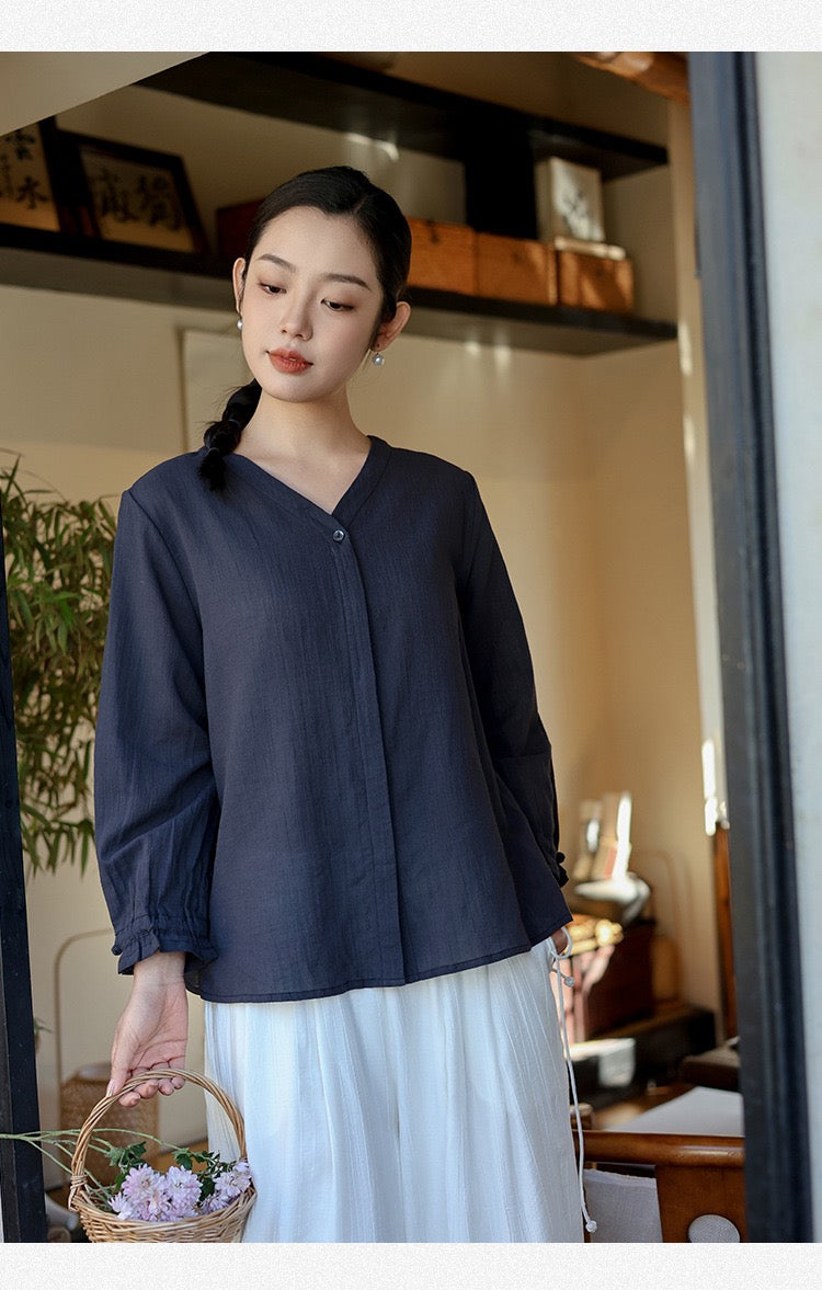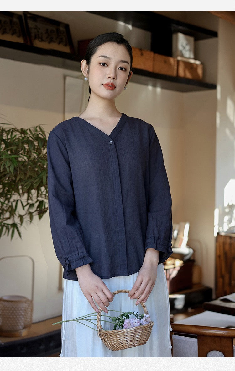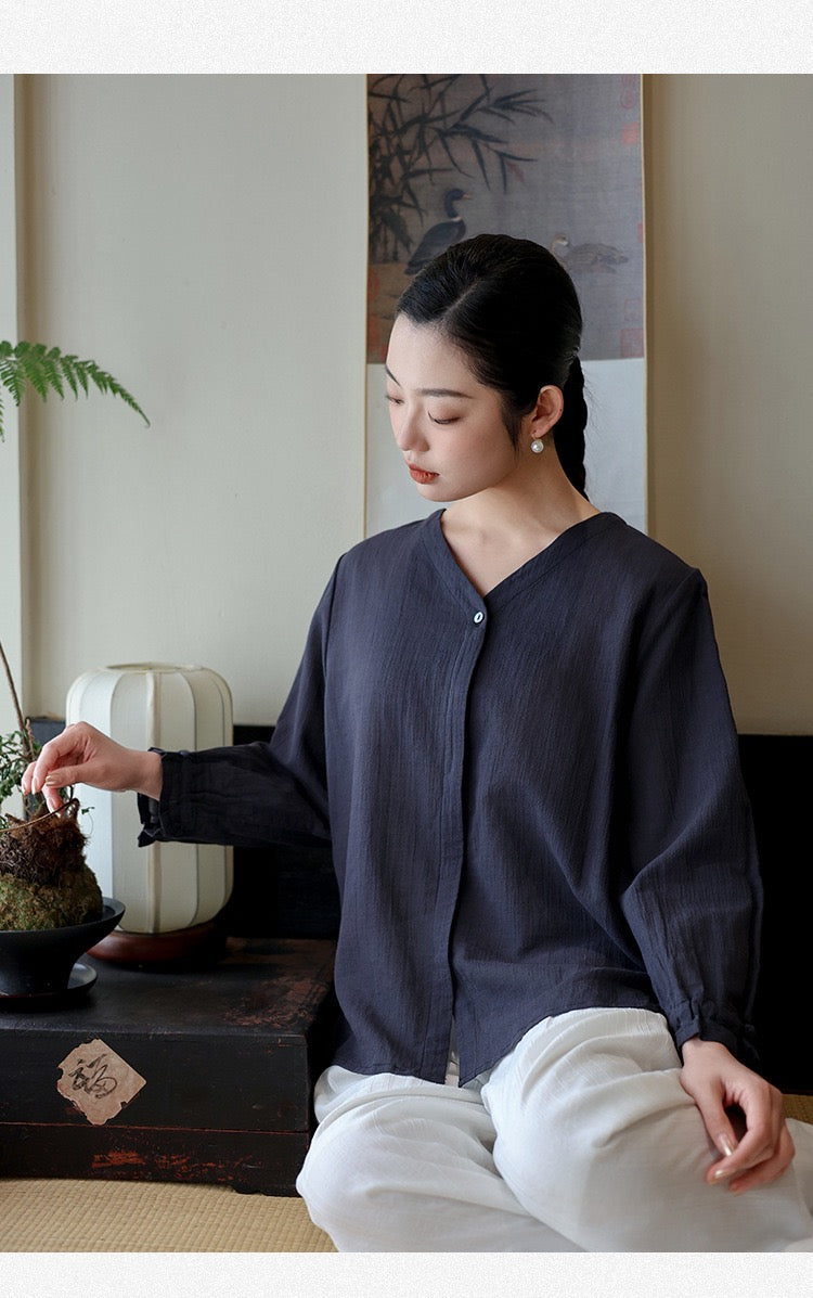 Woven from a gentle blend of linen and cotton, sand-washed for softness, it touches the skin like early morning mist on a mountain lake. Natural, breathable, and unhurried—this top is for those who walk with intention, whether through bustling streets or tranquil gardens.