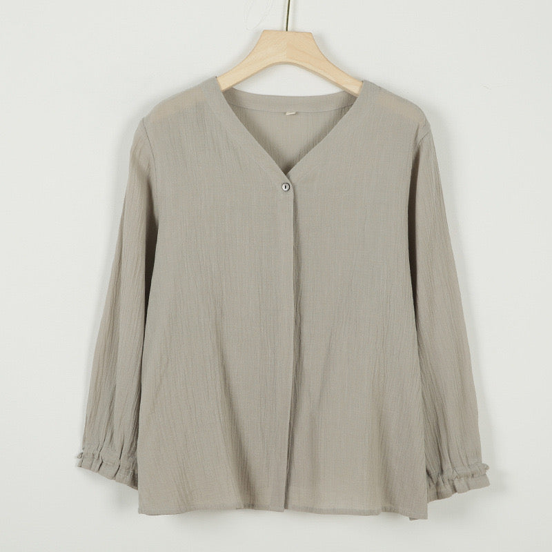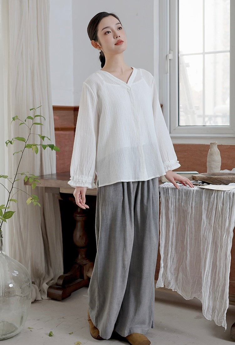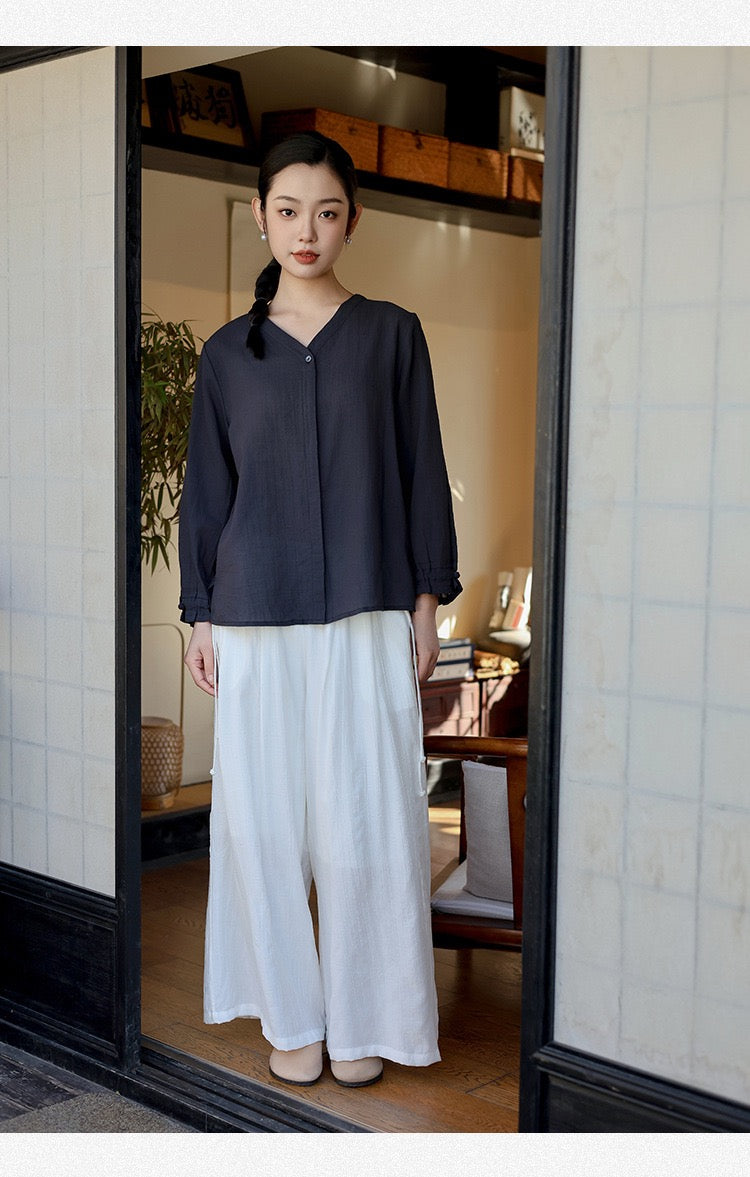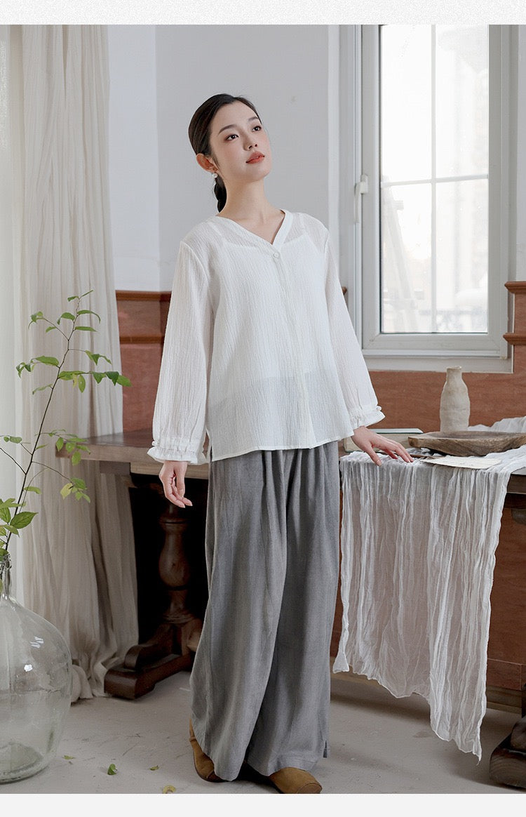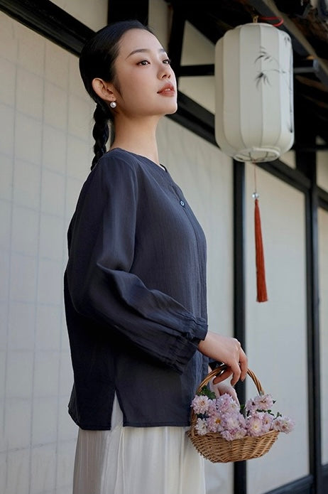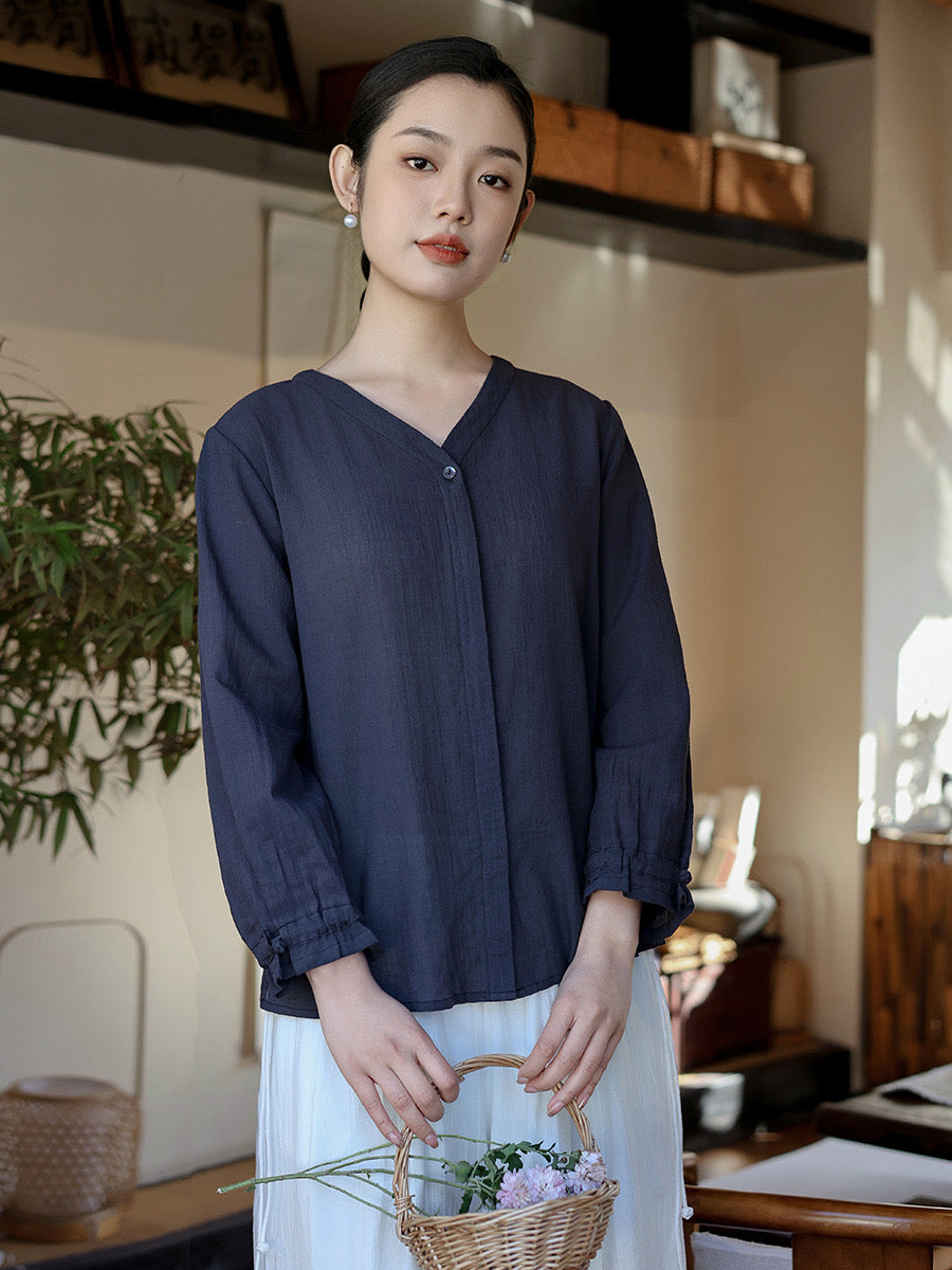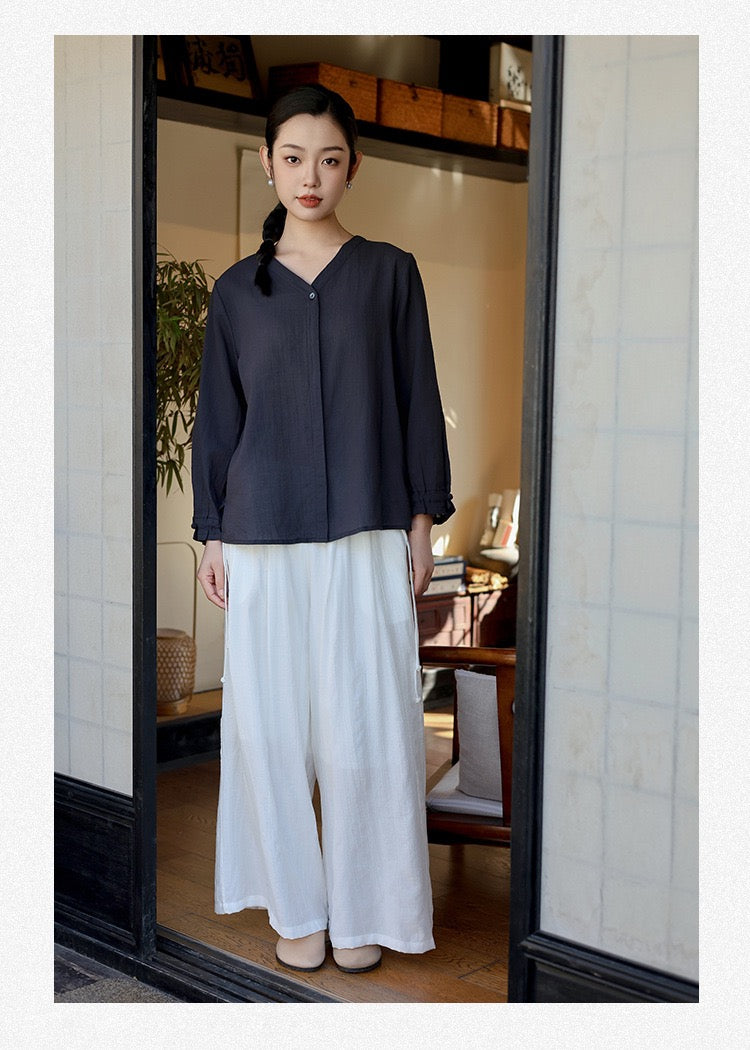 Woven from a gentle blend of linen and cotton, sand-washed for softness, it touches the skin like early morning mist on a mountain lake. Natural, breathable, and unhurried—this top is for those who walk with intention, whether through bustling streets or tranquil gardens.