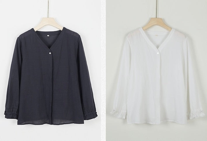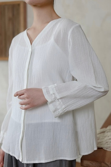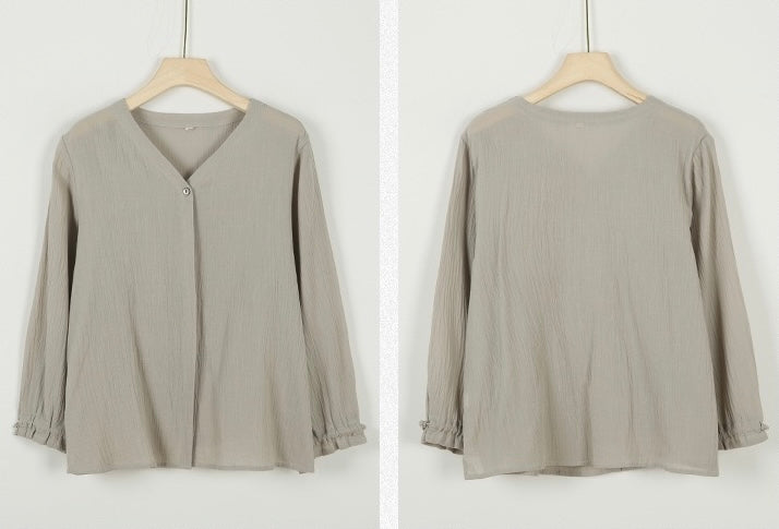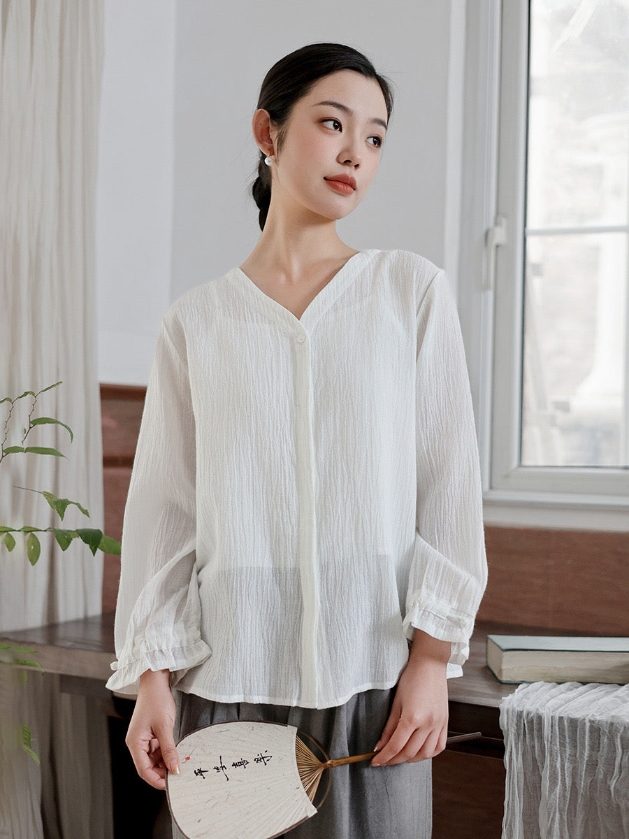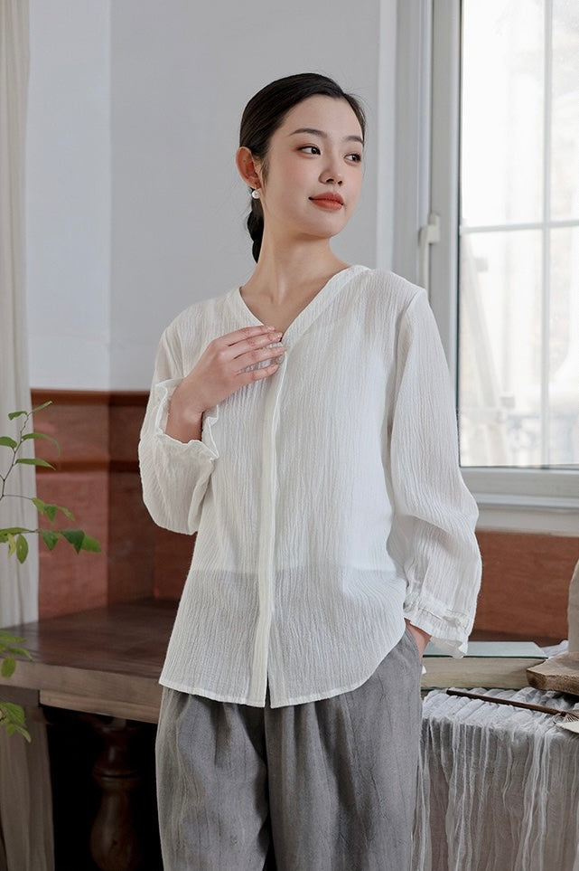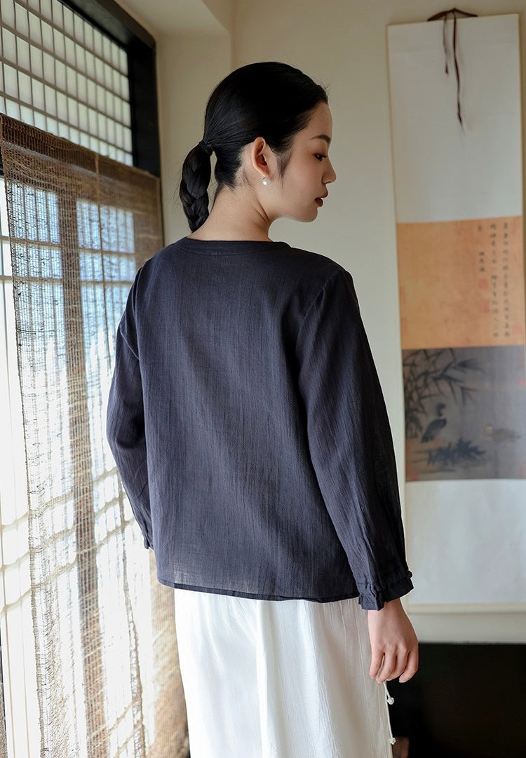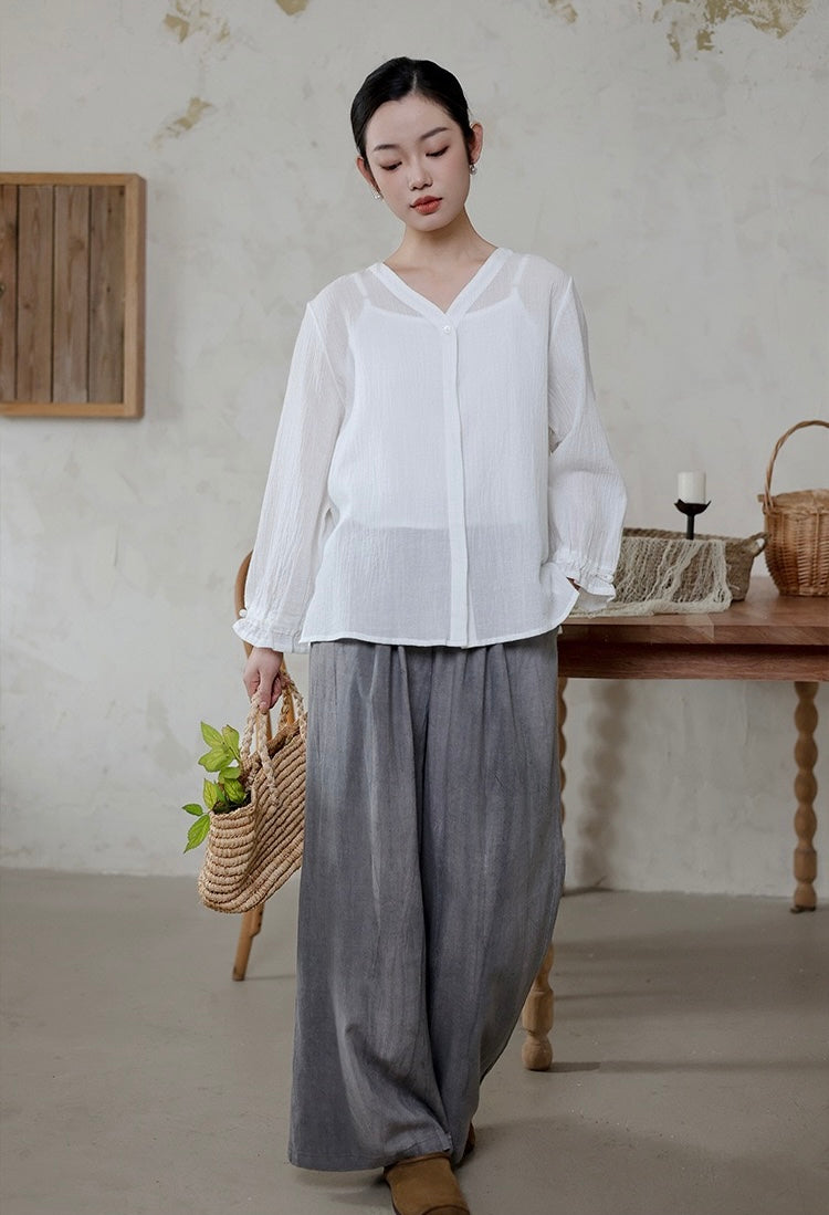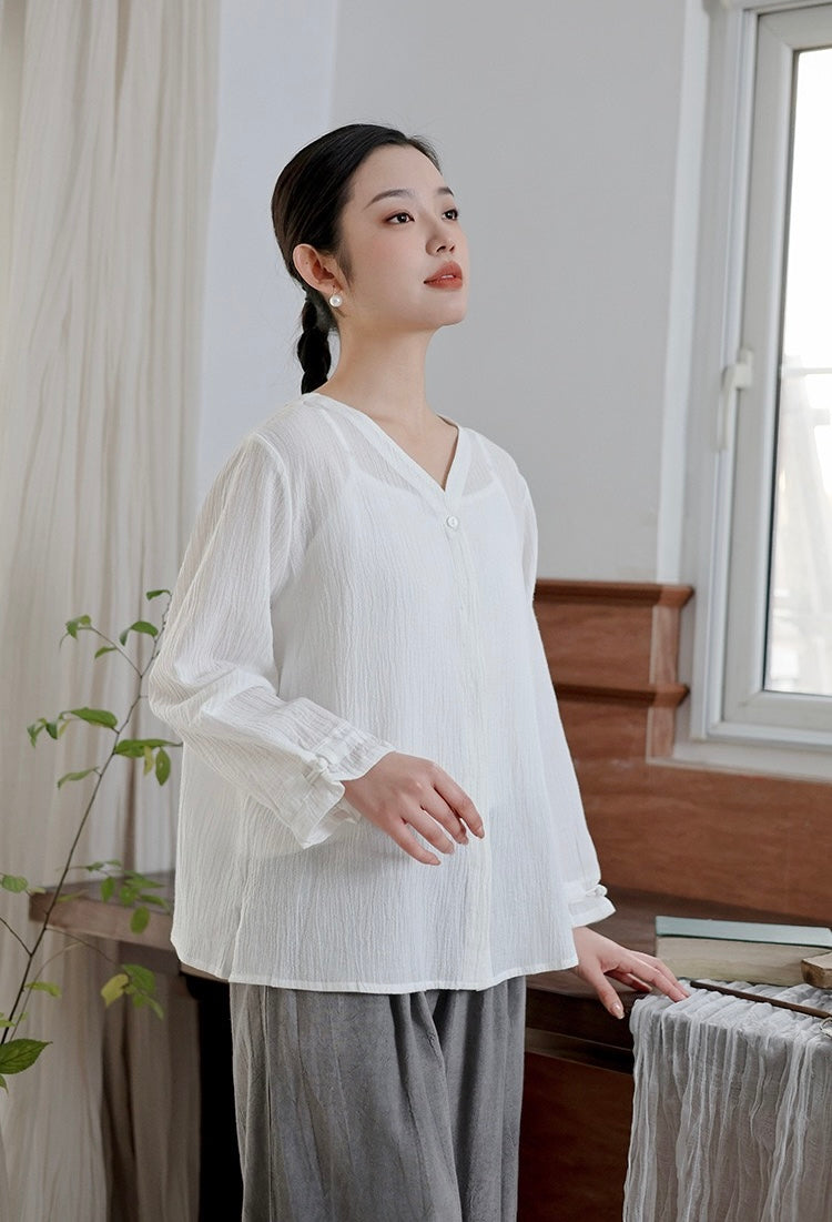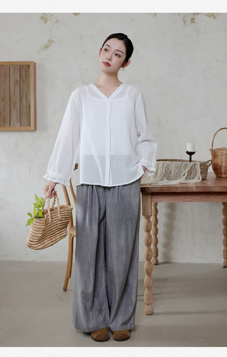 Woven from a gentle blend of linen and cotton, sand-washed for softness, it touches the skin like early morning mist on a mountain lake. Natural, breathable, and unhurried—this top is for those who walk with intention, whether through bustling streets or tranquil gardens.