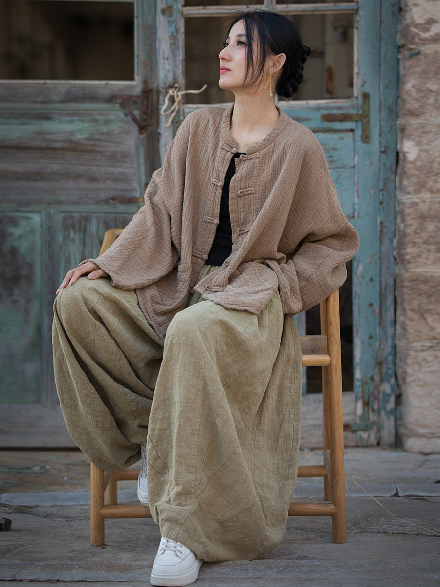 Designed for all seasons and all moments, from meditation to travel, this long-sleeve cardigan with a stand-up collar and tech pockets merges the essence of Zen with the spirit of timeless innovation.