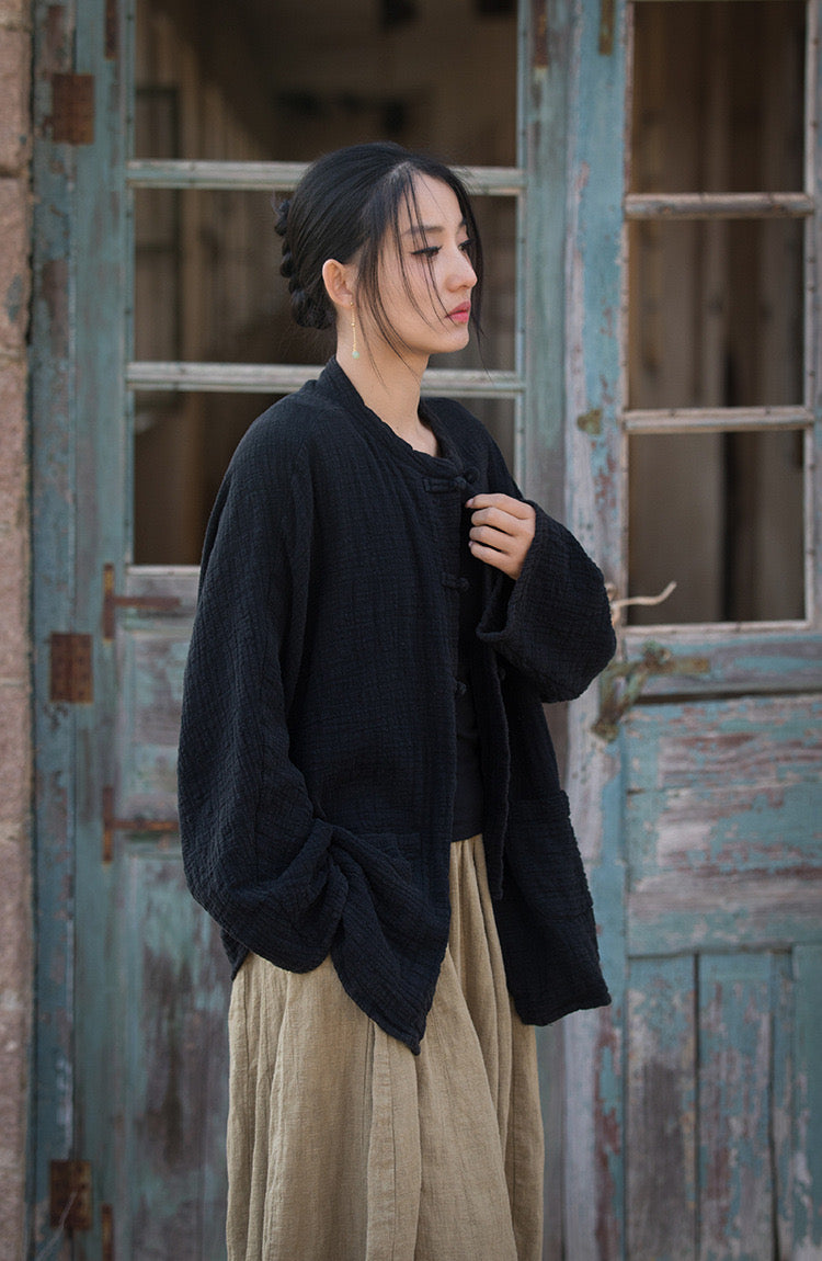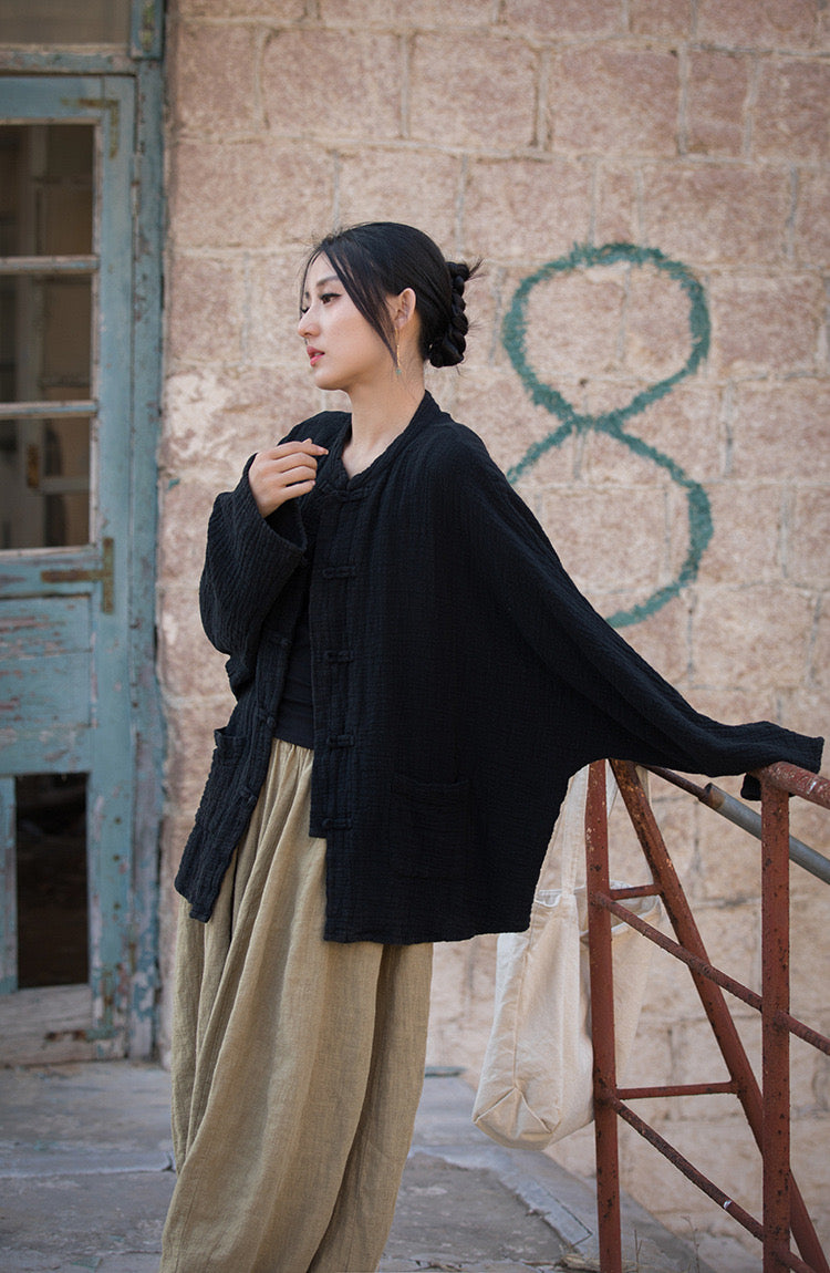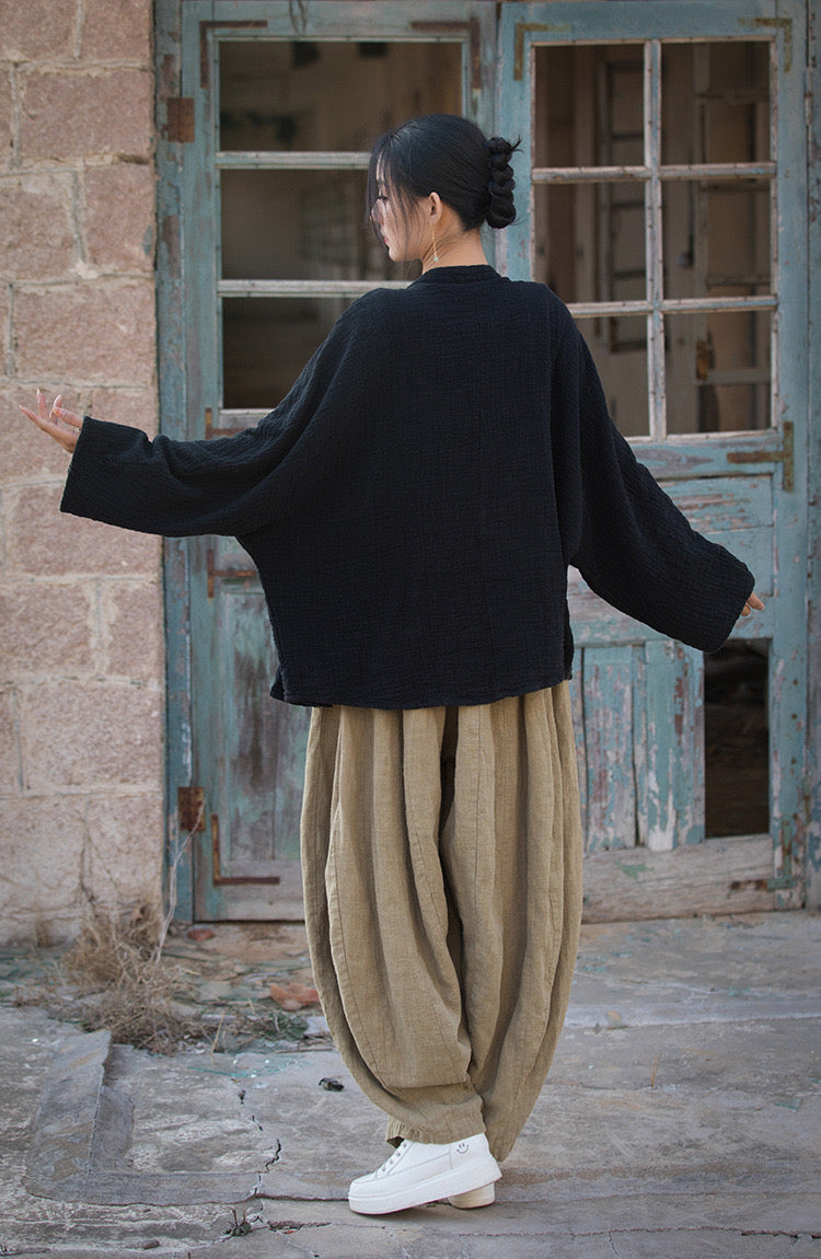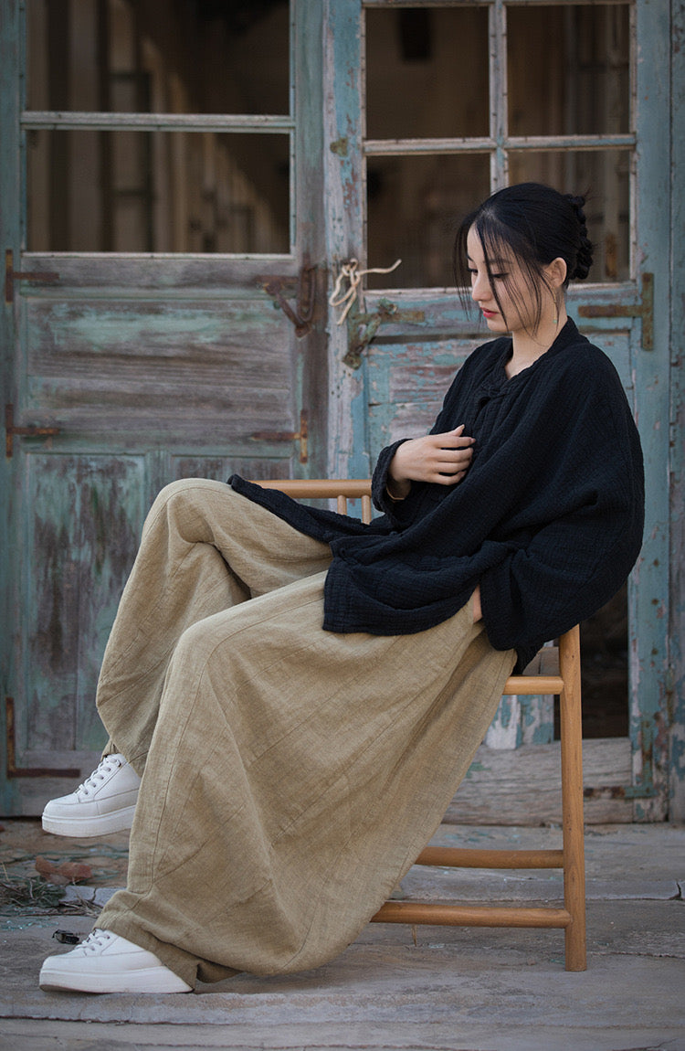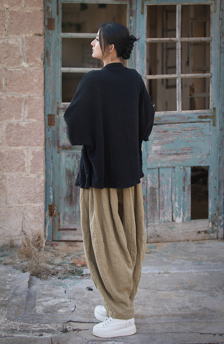 Adorned with butterfly wings—flourishing in daylight and unfolding as bat wings by night—this cardigan reflects the sacred dance of opposites. The five buttons, echoing the five elements, and the sand-washed colors of Antique Bronze Black and Antique Bronze Khaki, weave a story of timeless wisdom and artistic grace. 🌿
