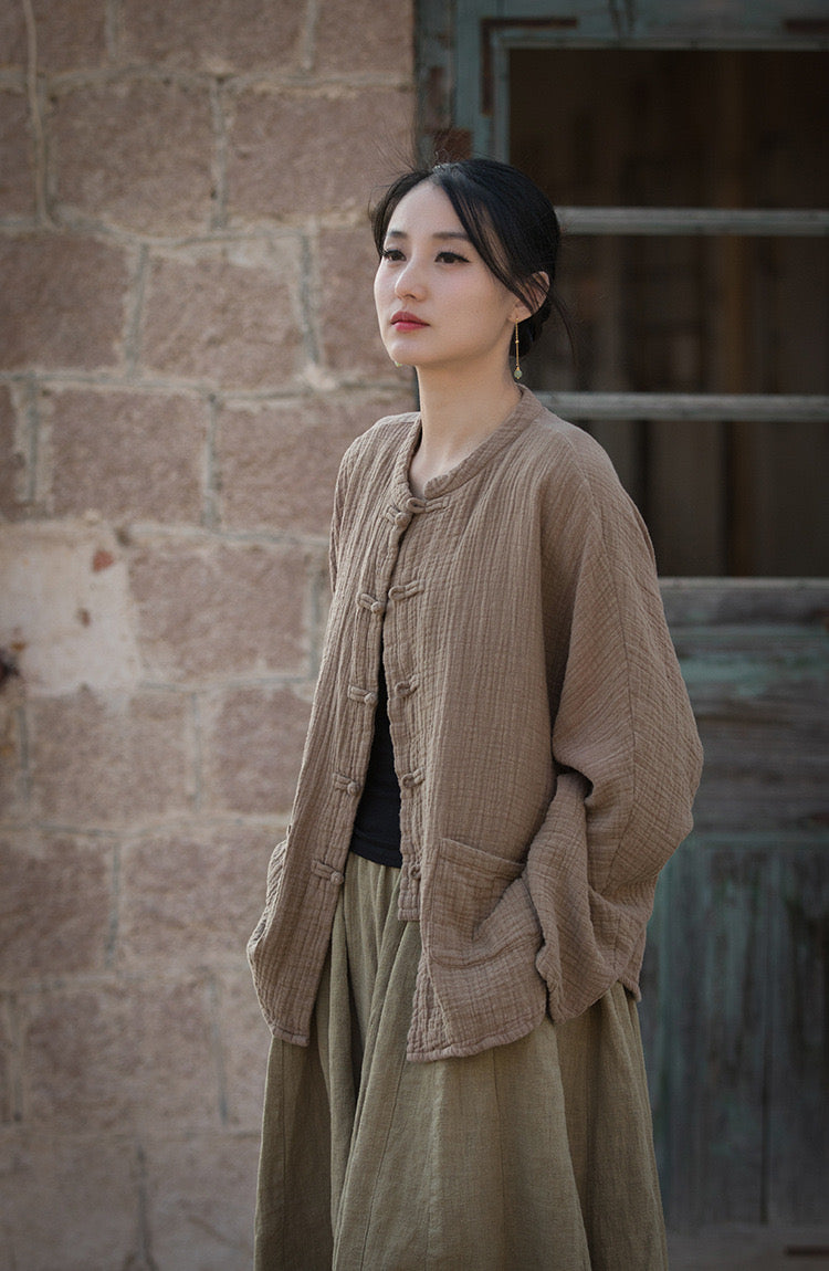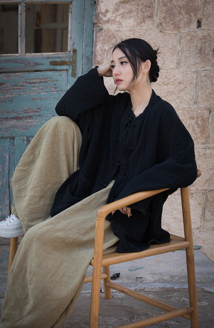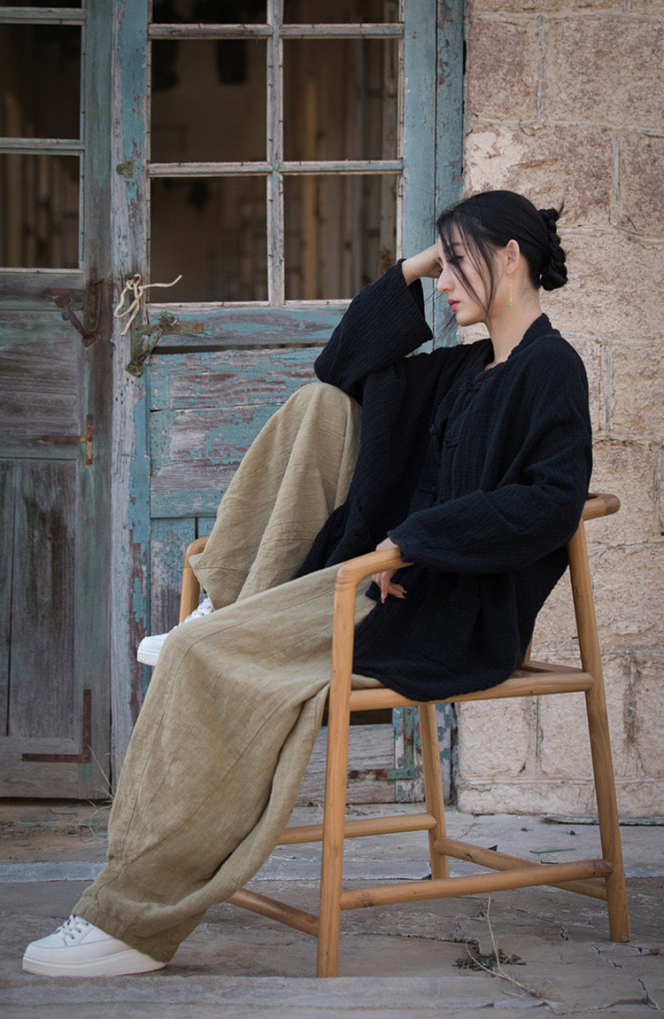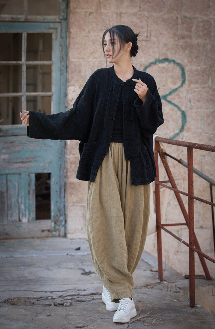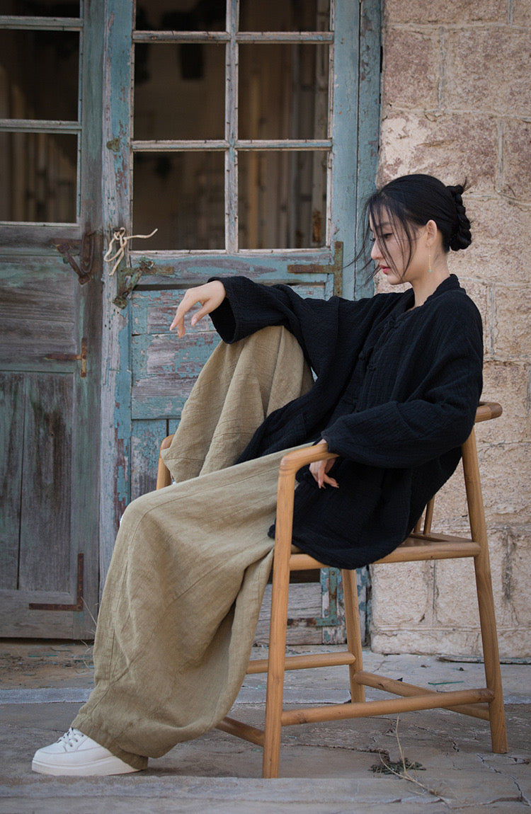 Adorned with butterfly wings—flourishing in daylight and unfolding as bat wings by night—this cardigan reflects the sacred dance of opposites. The five buttons, echoing the five elements, and the sand-washed colors of Antique Bronze Black and Antique Bronze Khaki, weave a story of timeless wisdom and artistic grace. 🌿