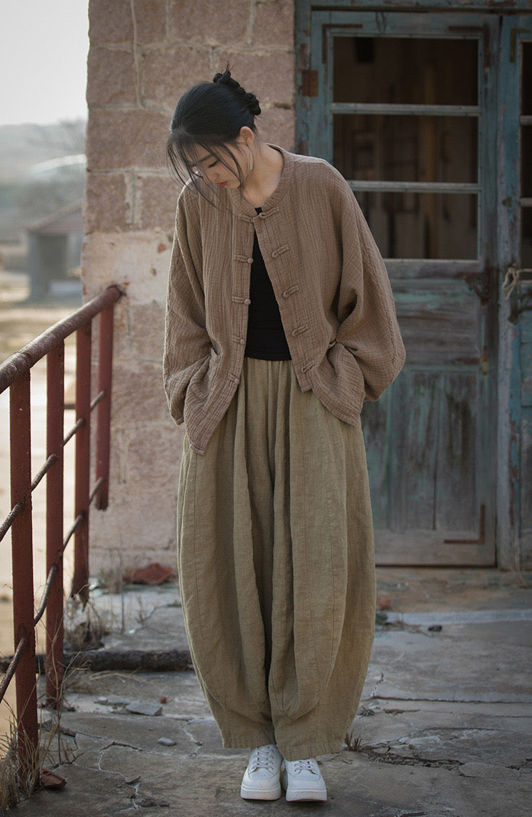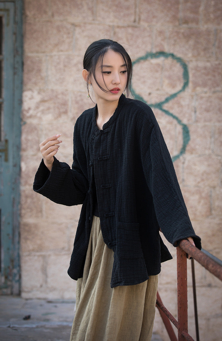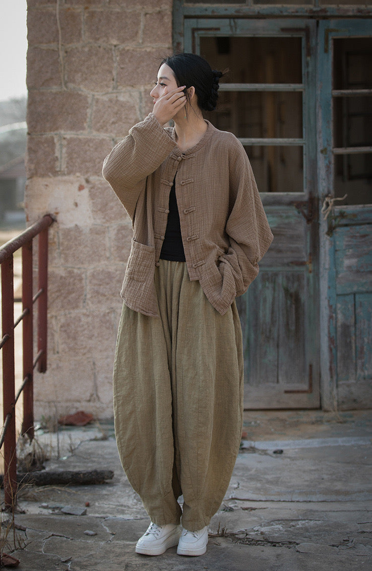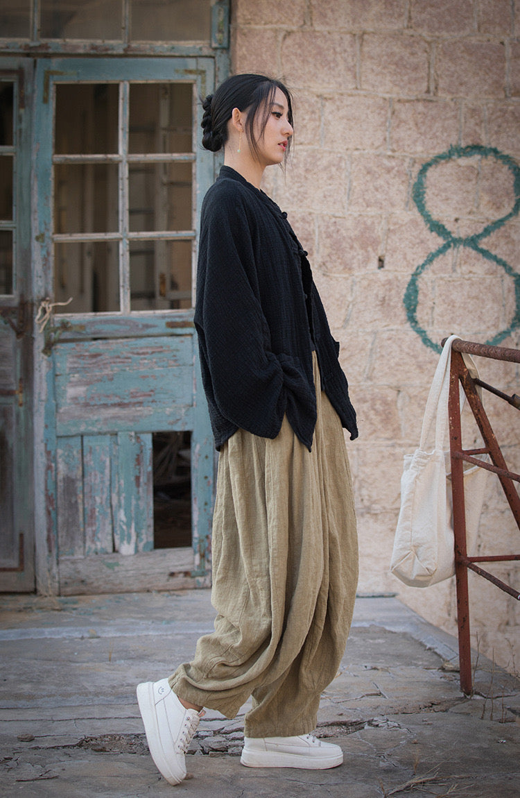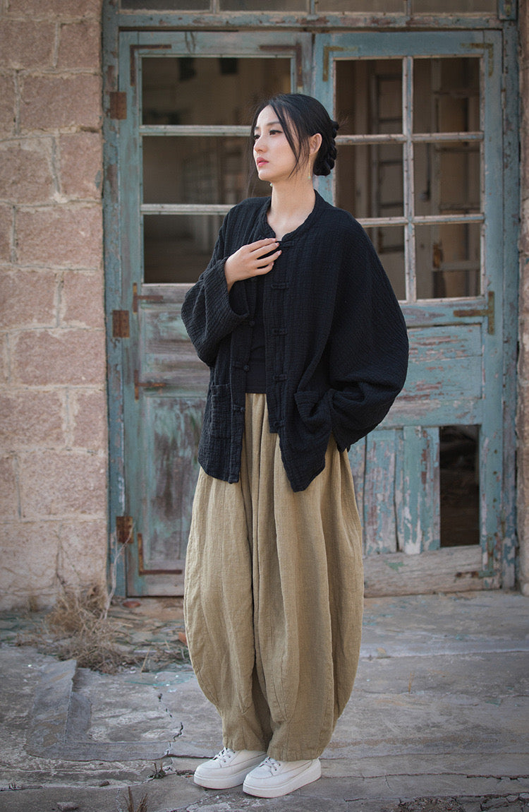 Adorned with butterfly wings—flourishing in daylight and unfolding as bat wings by night—this cardigan reflects the sacred dance of opposites. The five buttons, echoing the five elements, and the sand-washed colors of Antique Bronze Black and Antique Bronze Khaki, weave a story of timeless wisdom and artistic grace. 🌿