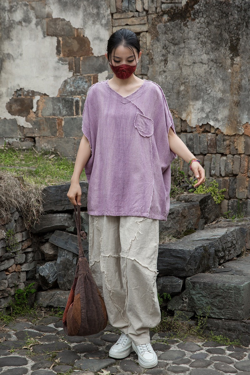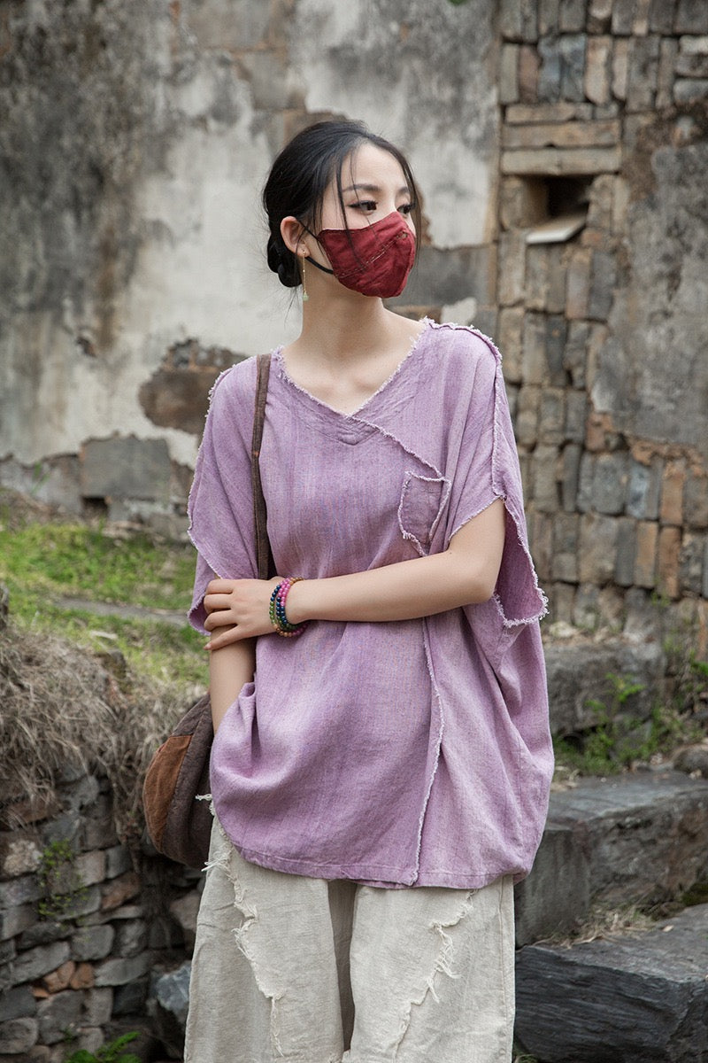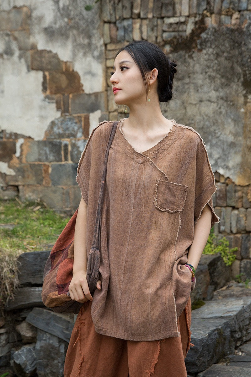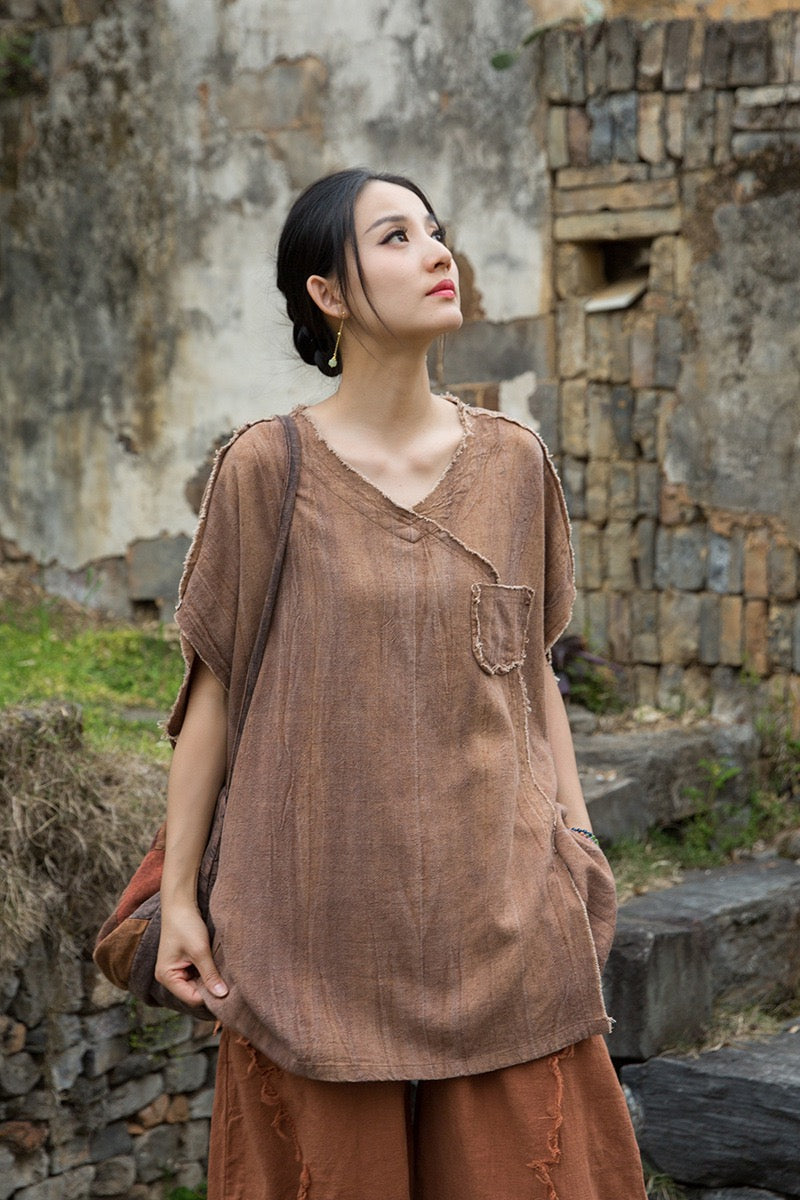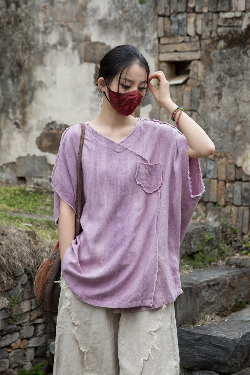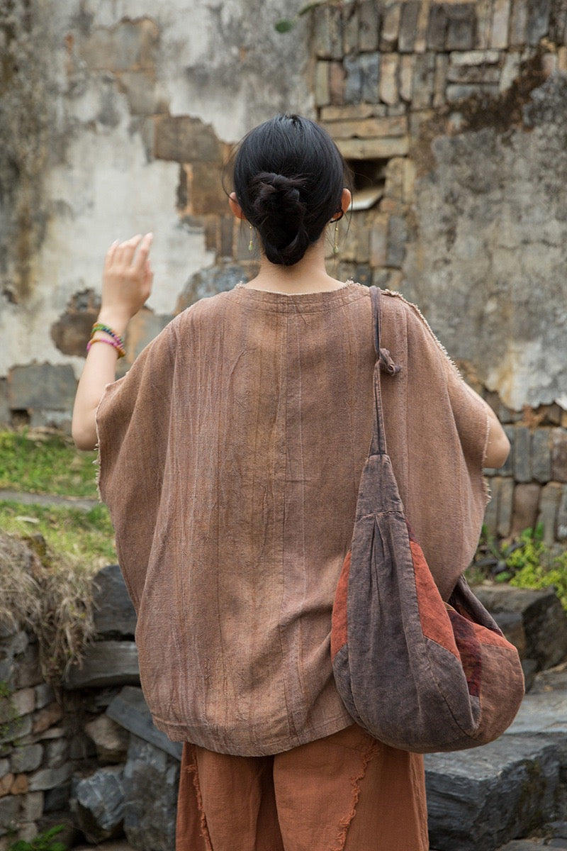 A sacred garment for the woman who walks between worlds — this asymmetrical Butterfly Zen tea shirt wraps you in balance and grace. The butterfly sleeves open like petals under the morning sun; as twilight arrives, their bat-winged drape mirrors the quiet mystery of nightfall.