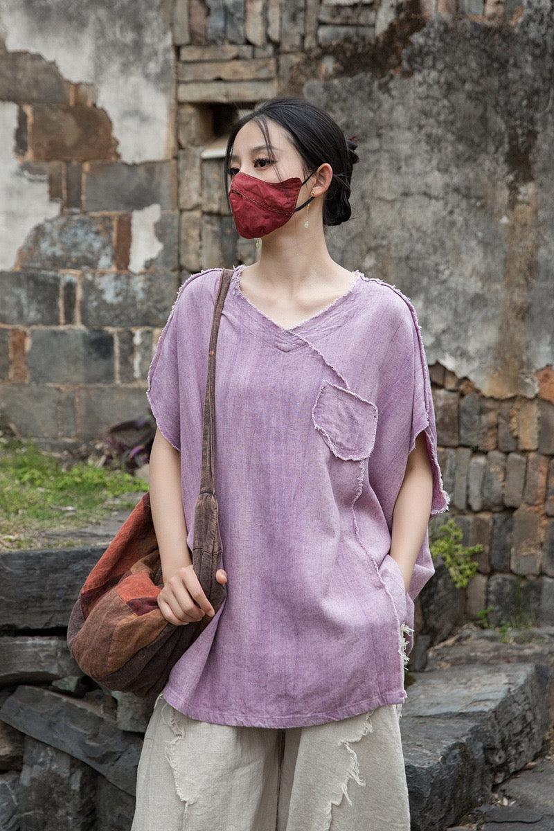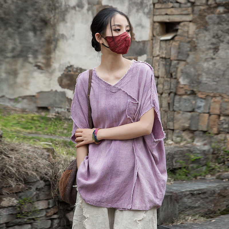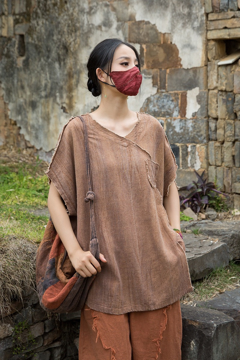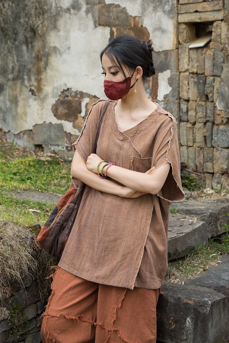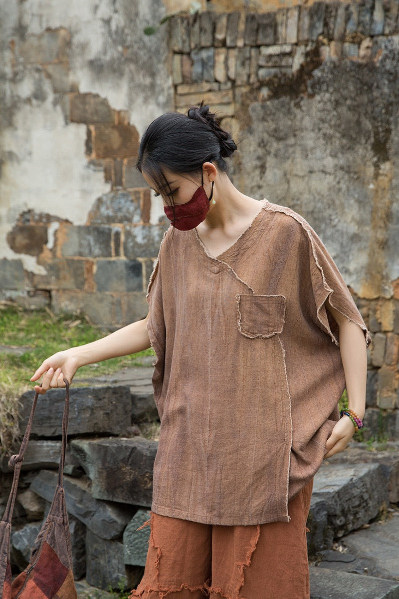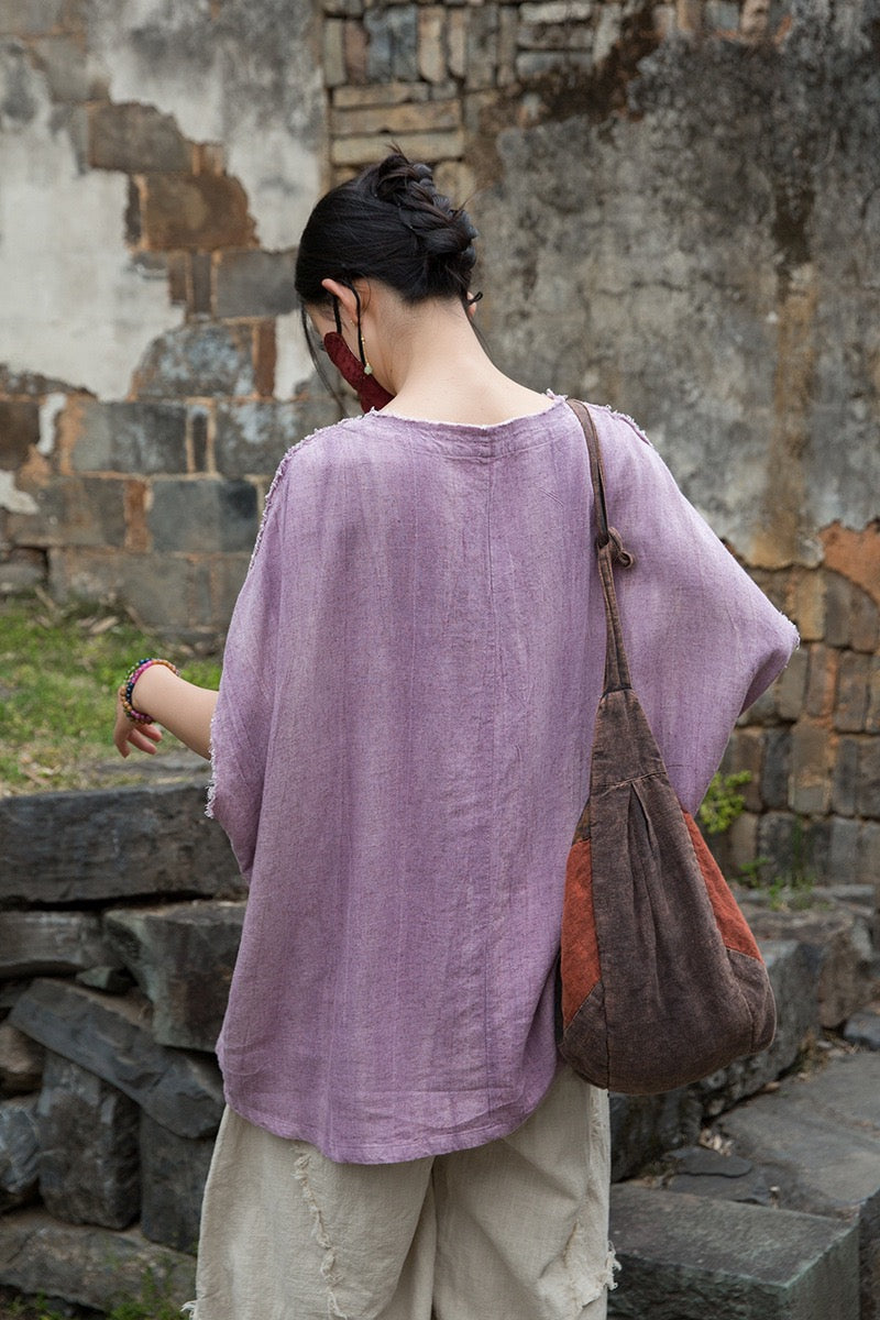 A sacred garment for the woman who walks between worlds — this asymmetrical Butterfly Zen tea shirt wraps you in balance and grace. The butterfly sleeves open like petals under the morning sun; as twilight arrives, their bat-winged drape mirrors the quiet mystery of nightfall.