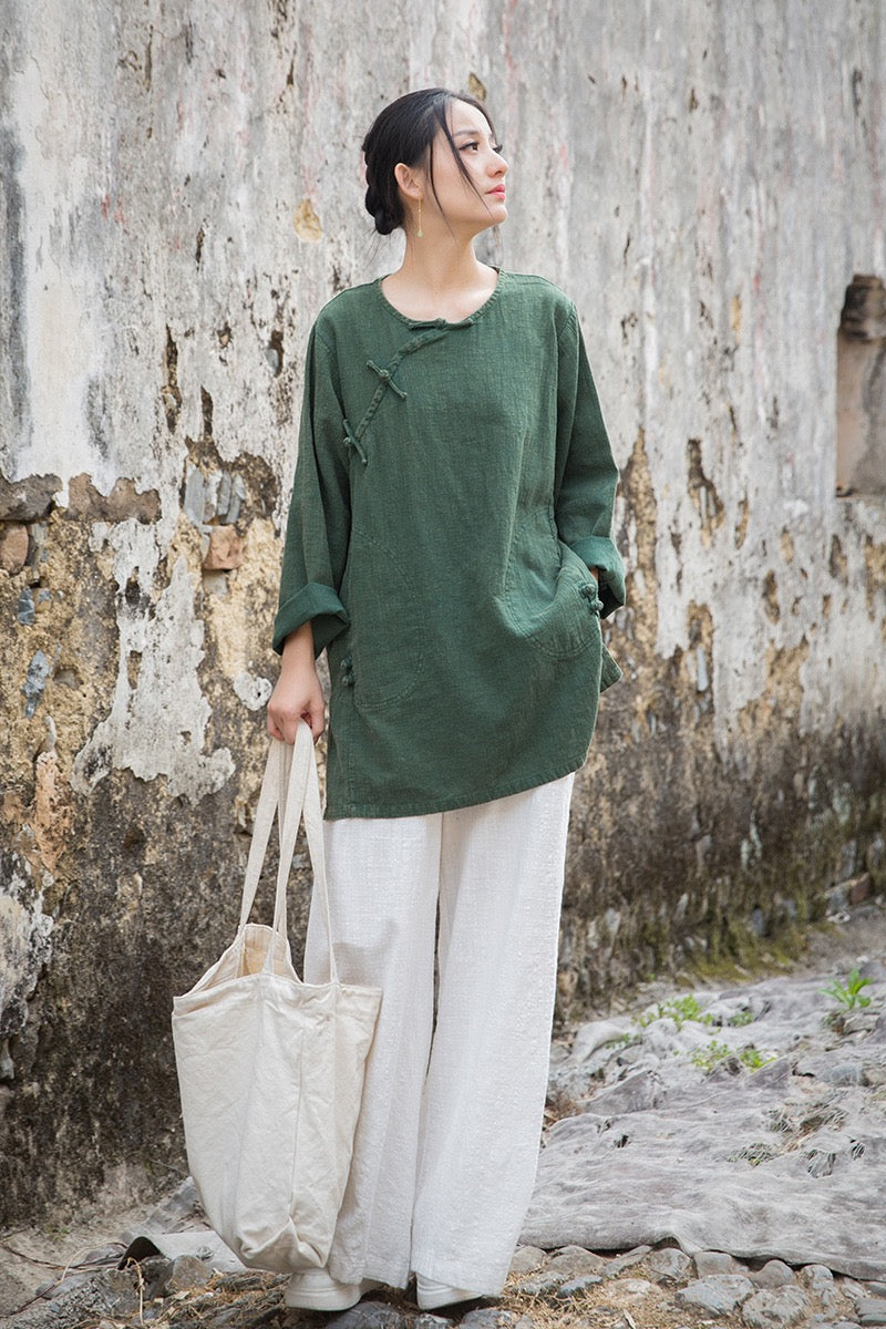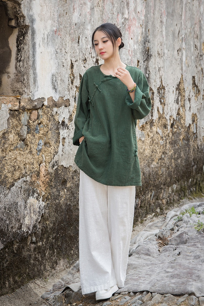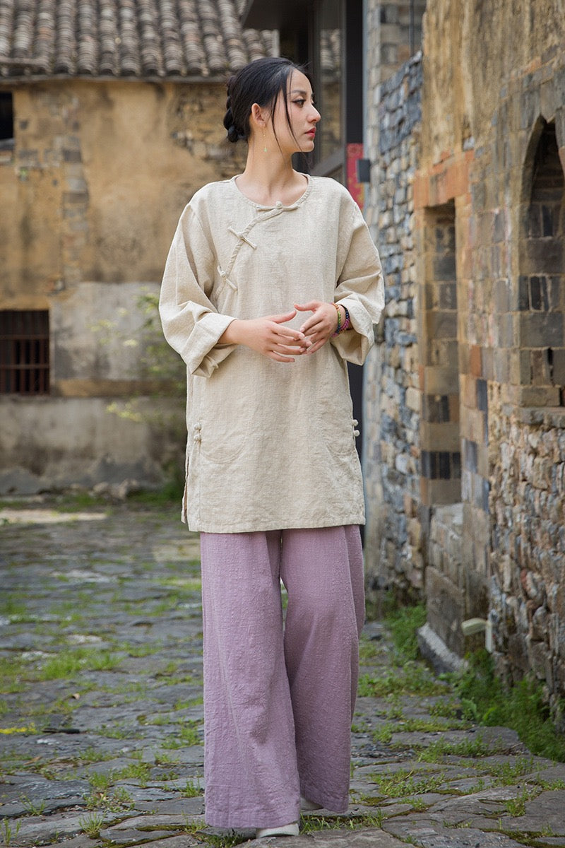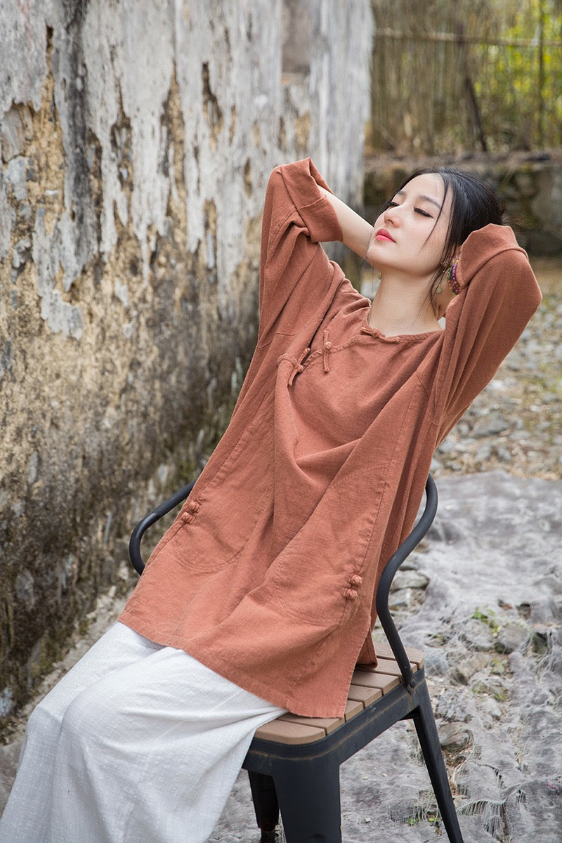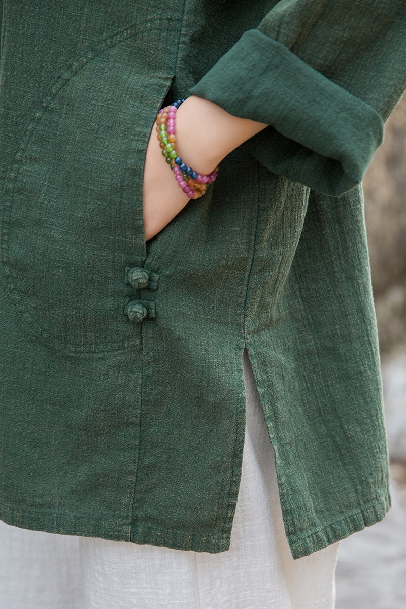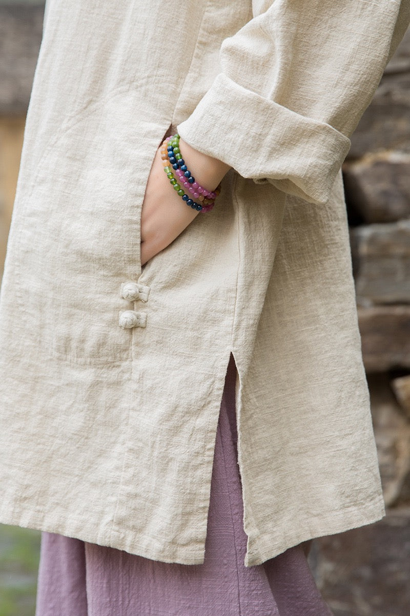 Introducing the Heaven & Earth Qigong Top — sand-washed ramie cotton, softened by time and the Tao. Flow freely in this loose, artistic silhouette with raglan sleeves and 3 buttons representing the cosmic Trinity: Heaven, Earth, and You.