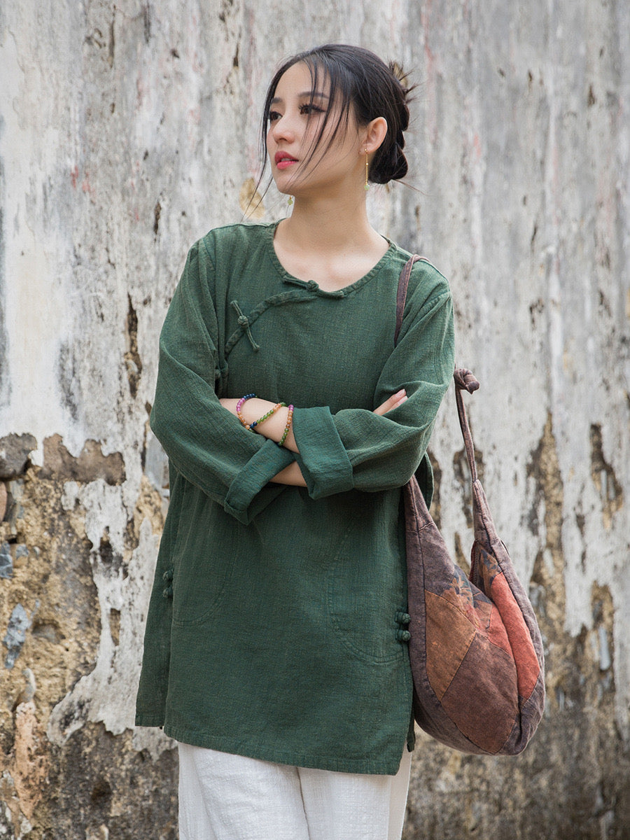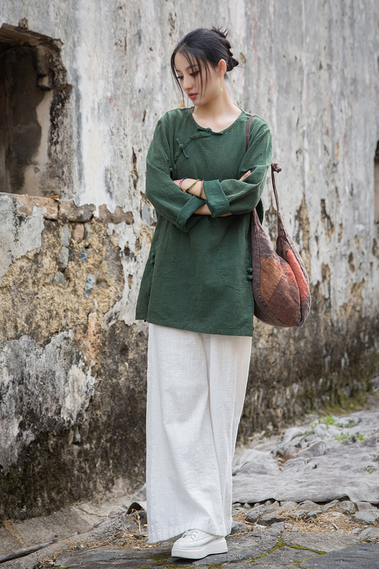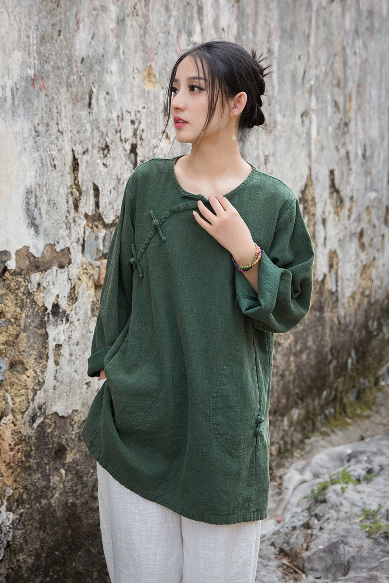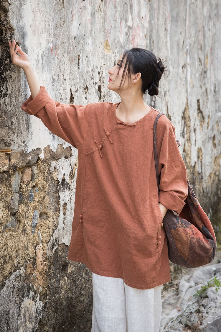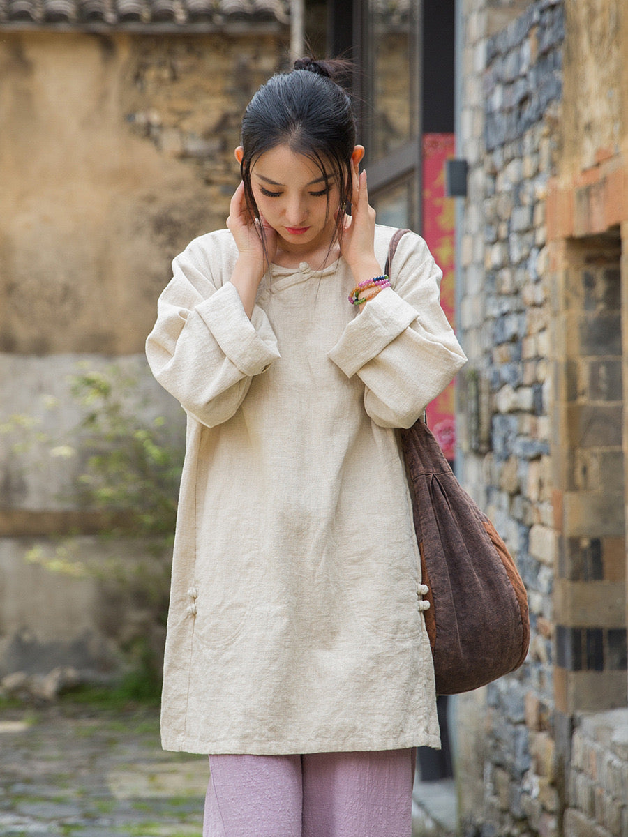 Introducing the Heaven & Earth Qigong Top — sand-washed ramie cotton, softened by time and the Tao. Flow freely in this loose, artistic silhouette with raglan sleeves and 3 buttons representing the cosmic Trinity: Heaven, Earth, and You.