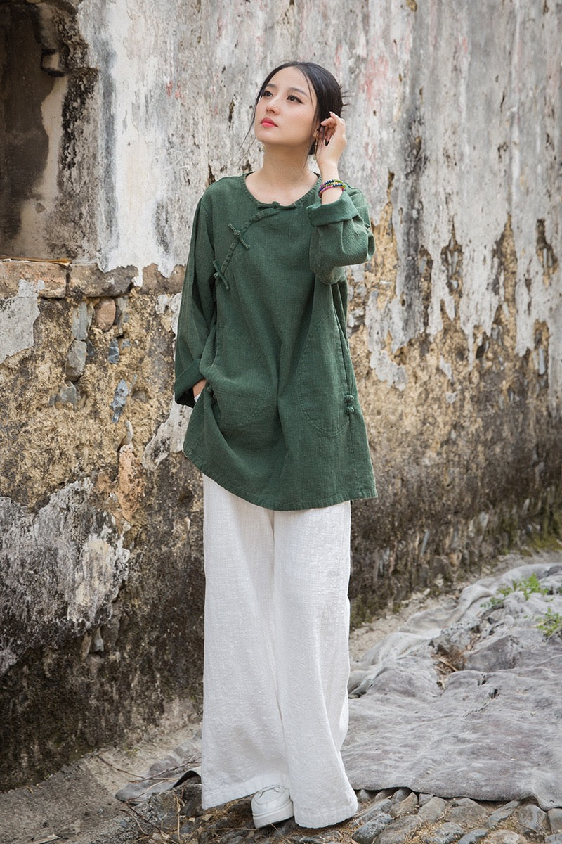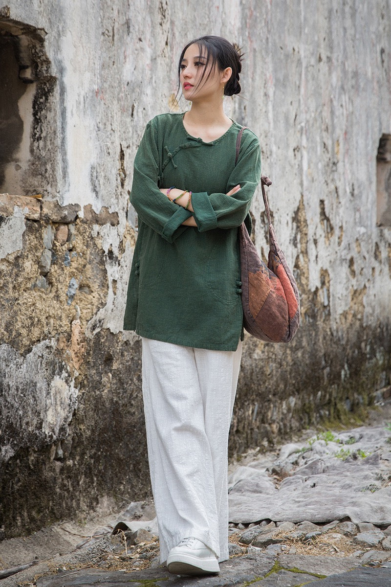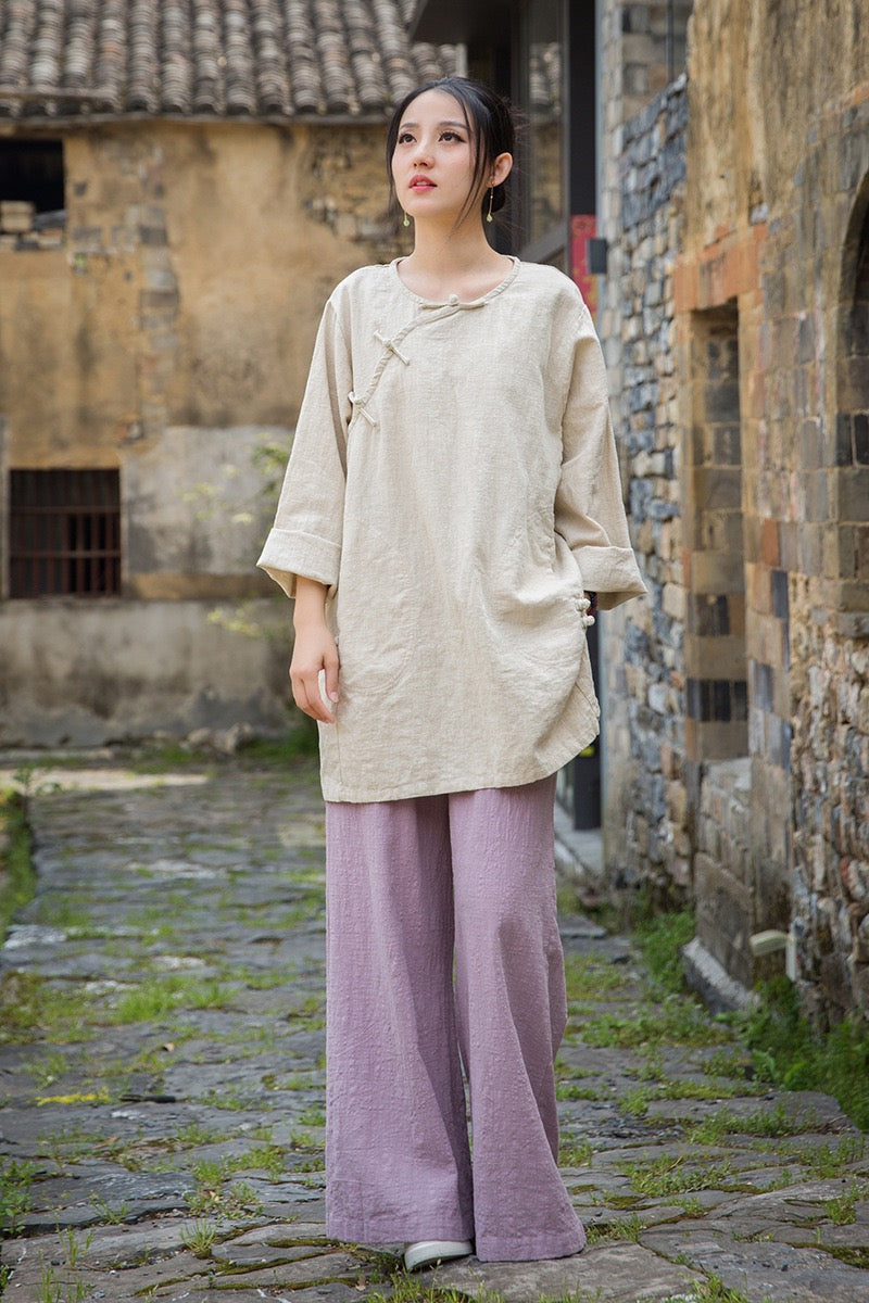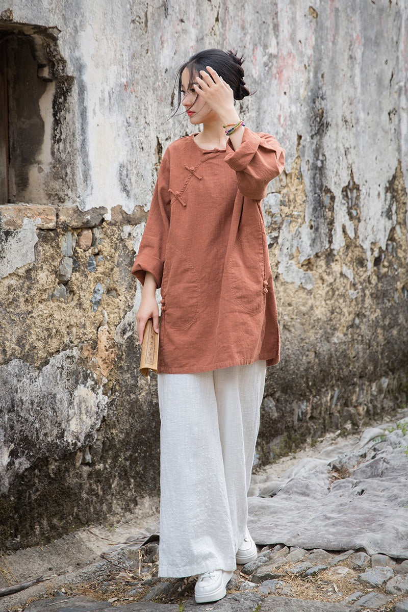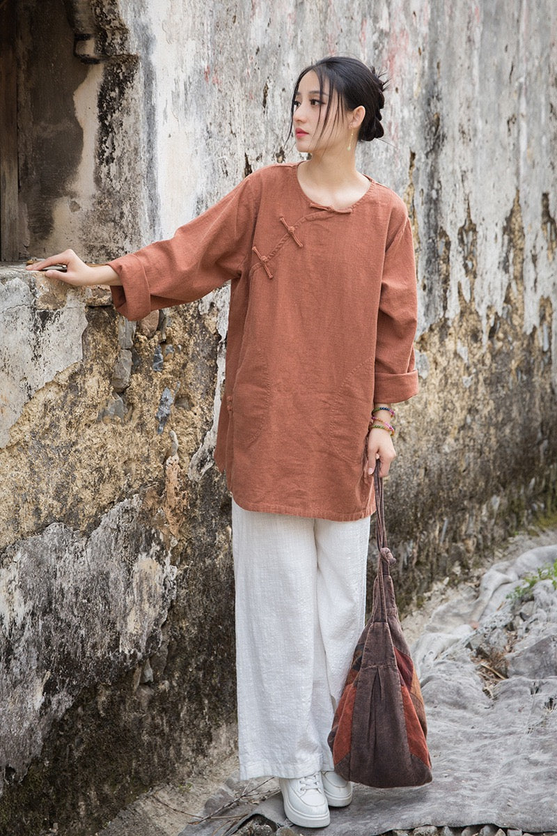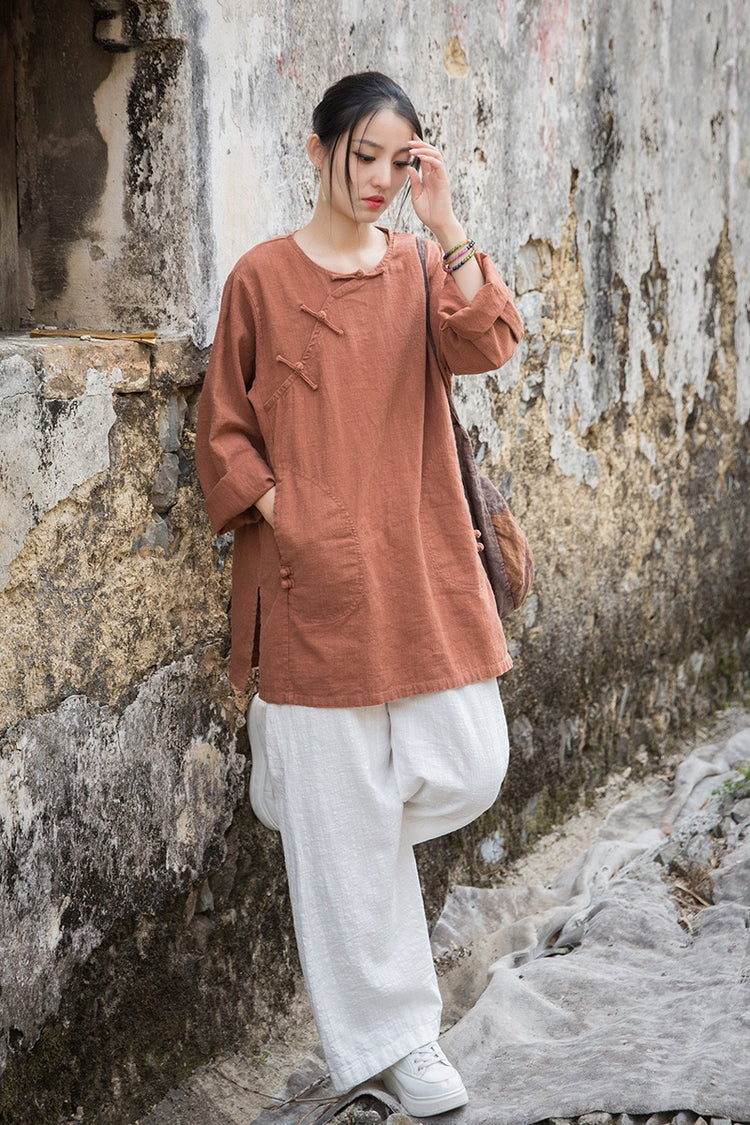Introducing the Heaven & Earth Qigong Top — sand-washed ramie cotton, softened by time and the Tao. Flow freely in this loose, artistic silhouette with raglan sleeves and 3 buttons representing the cosmic Trinity: Heaven, Earth, and You.