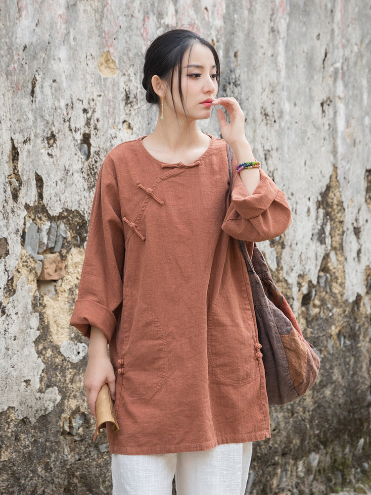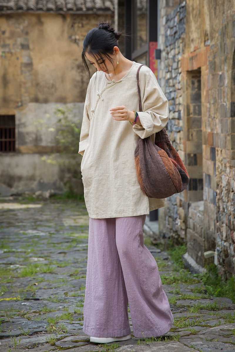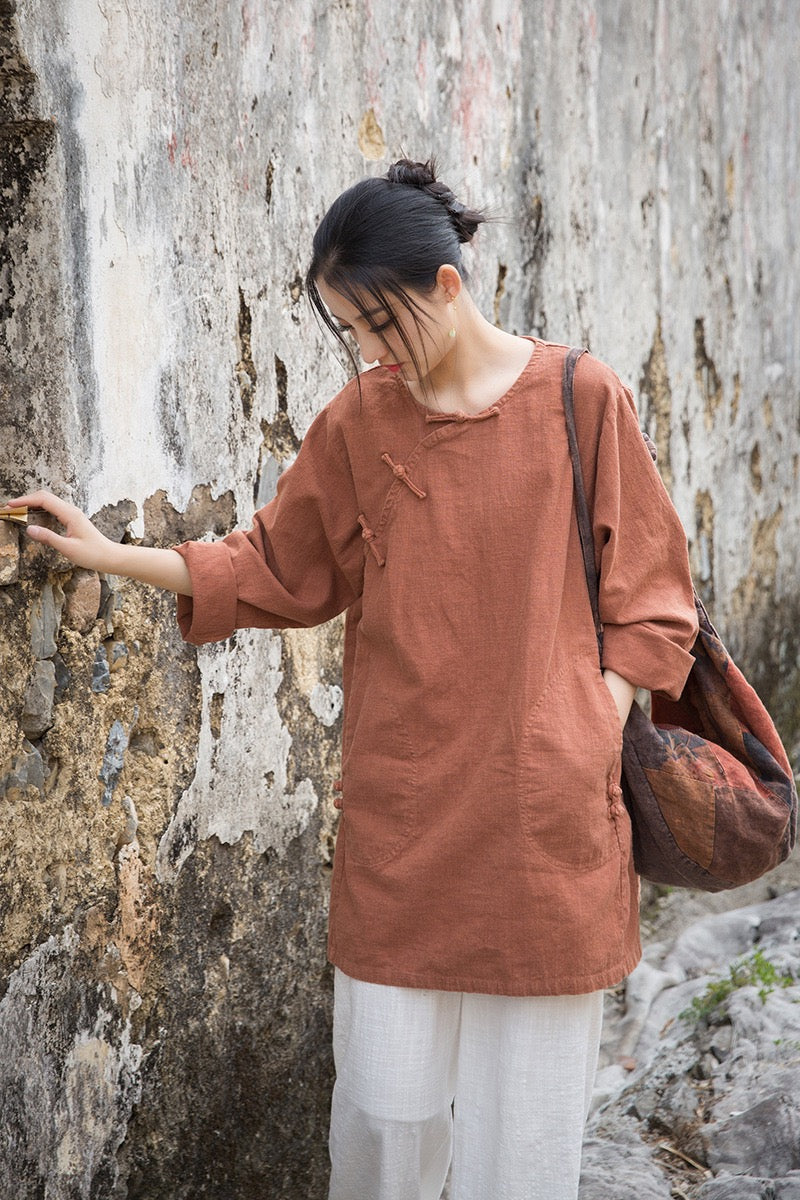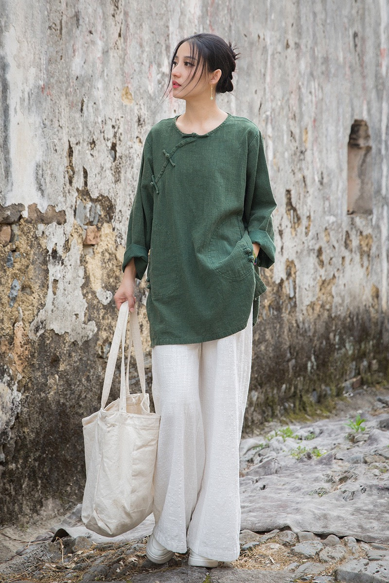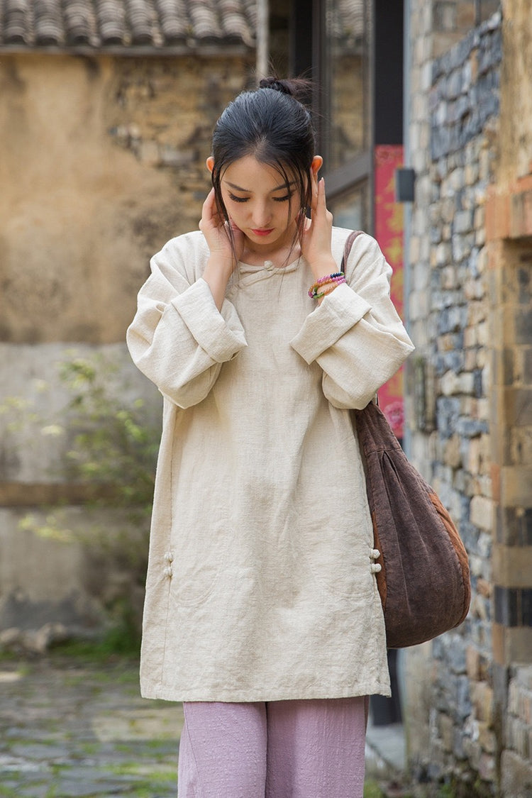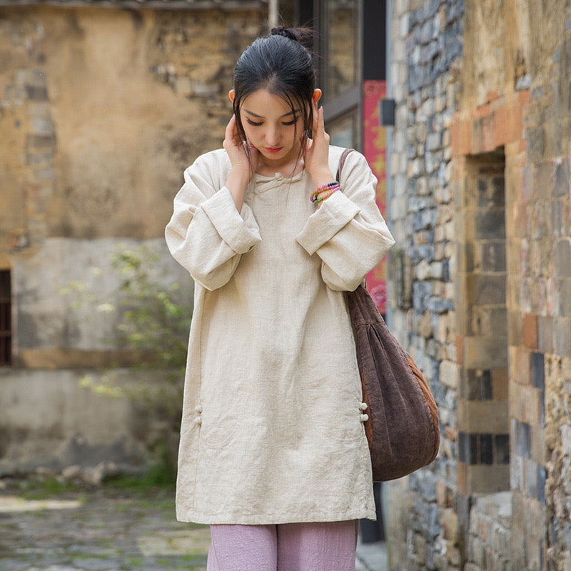 Introducing the Heaven & Earth Qigong Top — sand-washed ramie cotton, softened by time and the Tao. Flow freely in this loose, artistic silhouette with raglan sleeves and 3 buttons representing the cosmic Trinity: Heaven, Earth, and You.