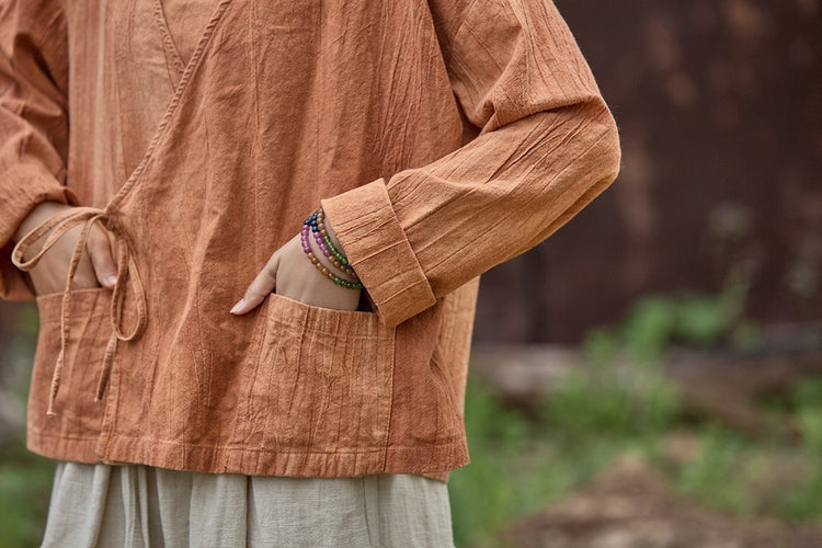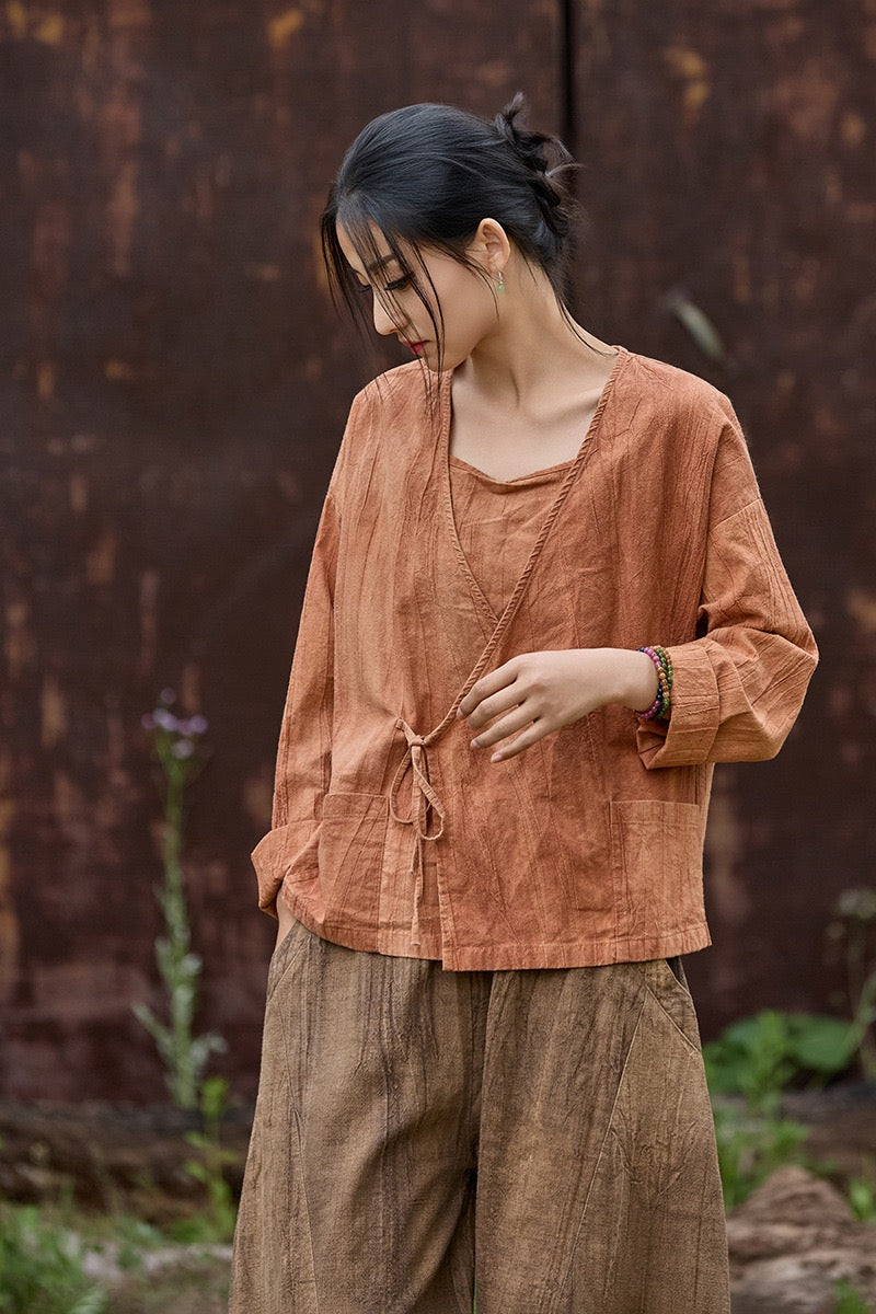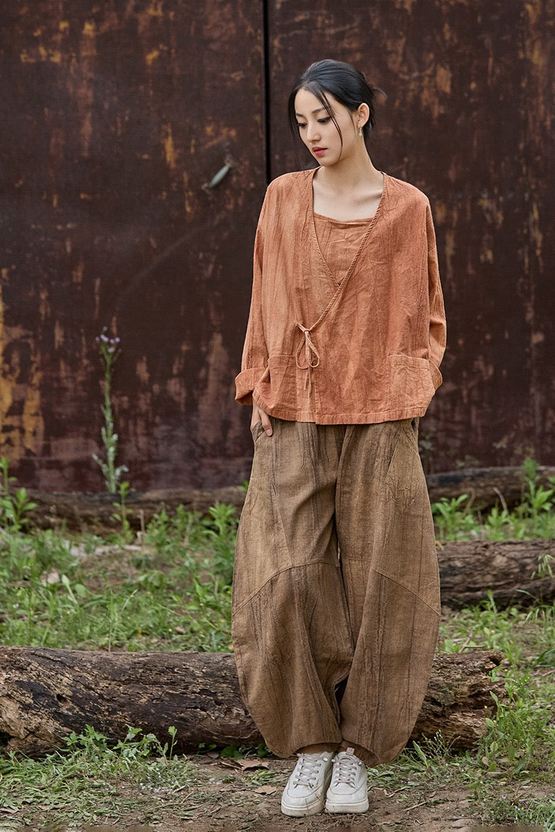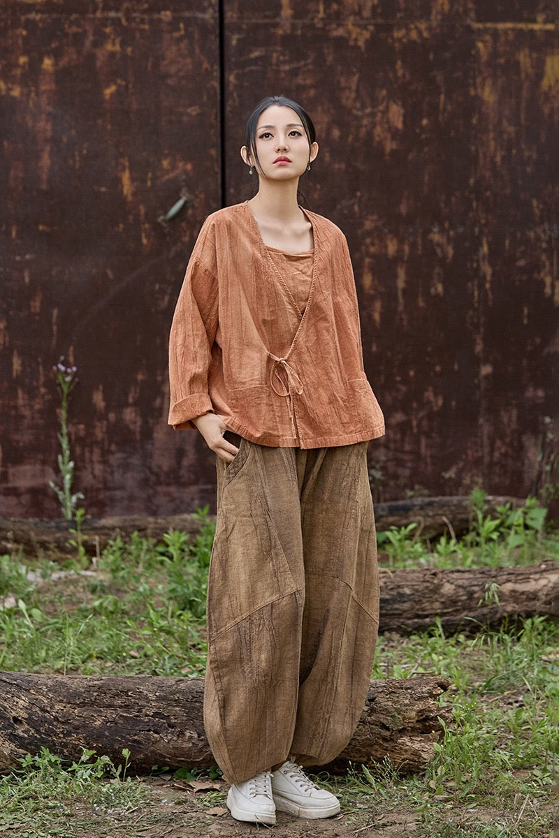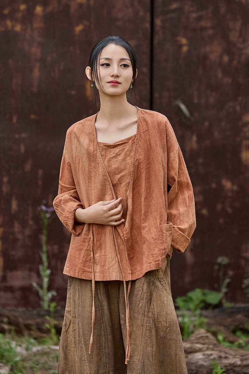 🧵 Made from ramie cotton, sand-washed and tie-dyed by hand, each piece carries the essence of water, earth, and time. The lace-up closure lets you adjust the rhythm — cinch when you seek stillness, loosen when you seek flow.