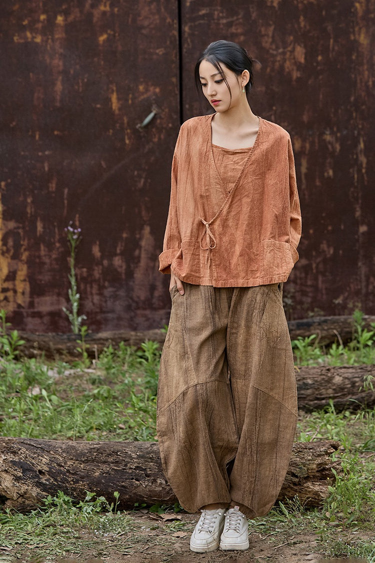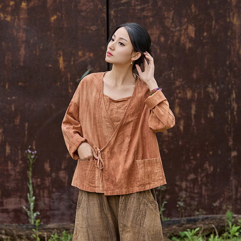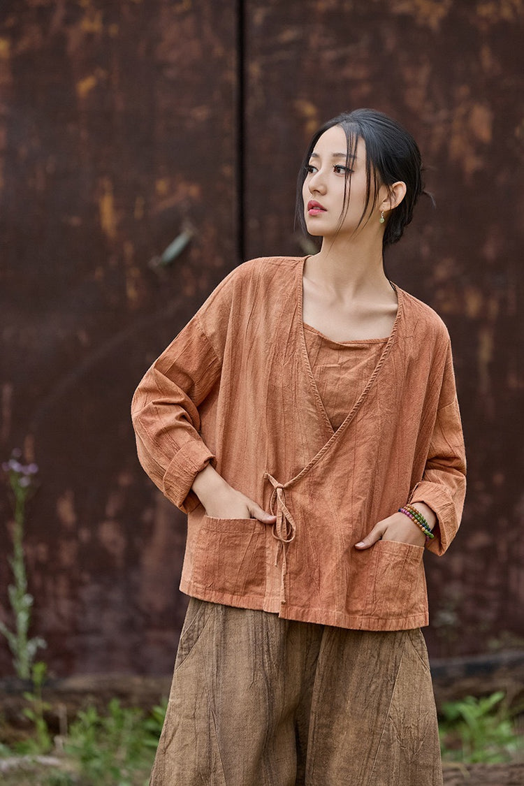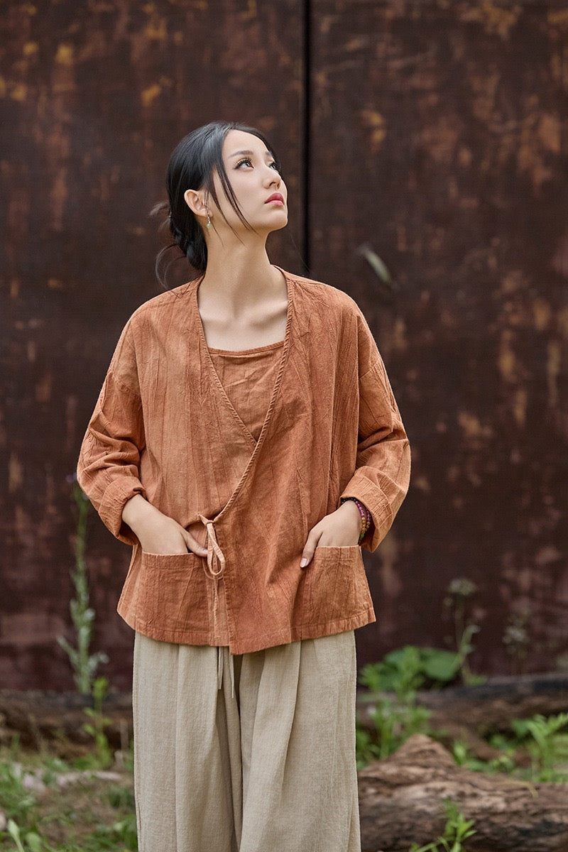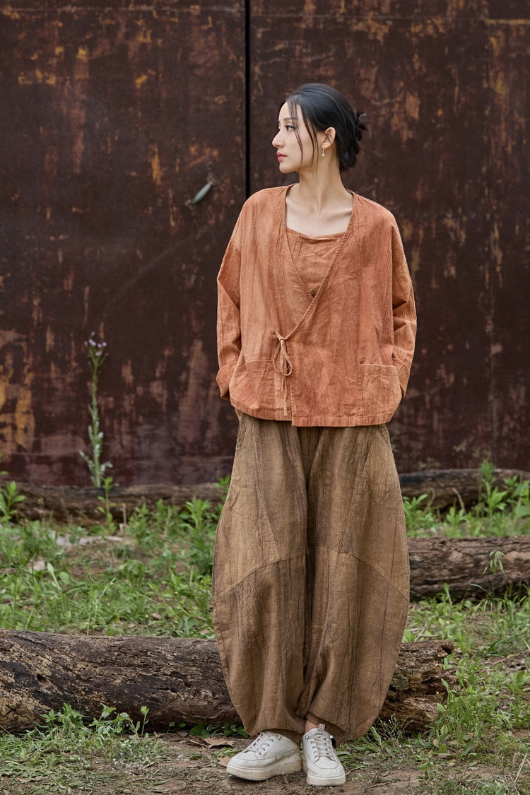 🧵 Made from ramie cotton, sand-washed and tie-dyed by hand, each piece carries the essence of water, earth, and time. The lace-up closure lets you adjust the rhythm — cinch when you seek stillness, loosen when you seek flow.