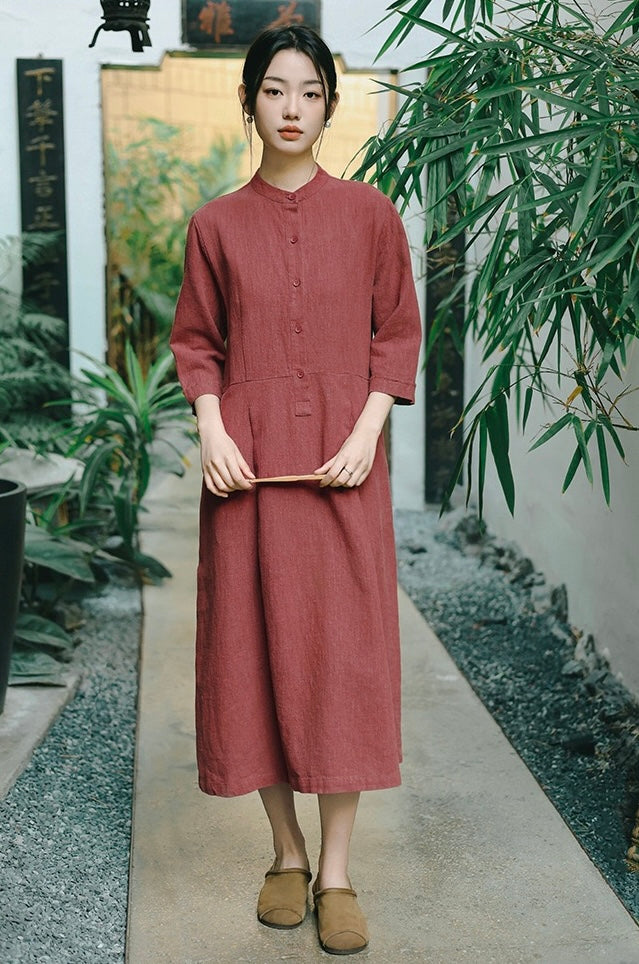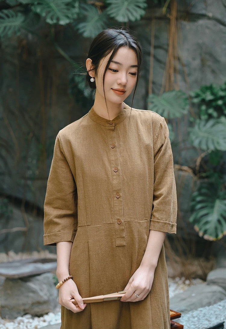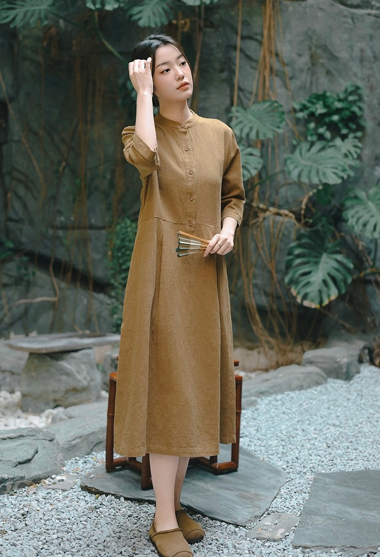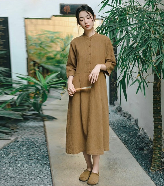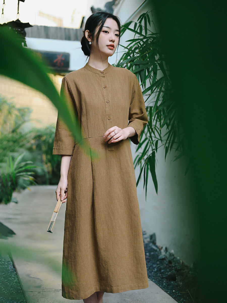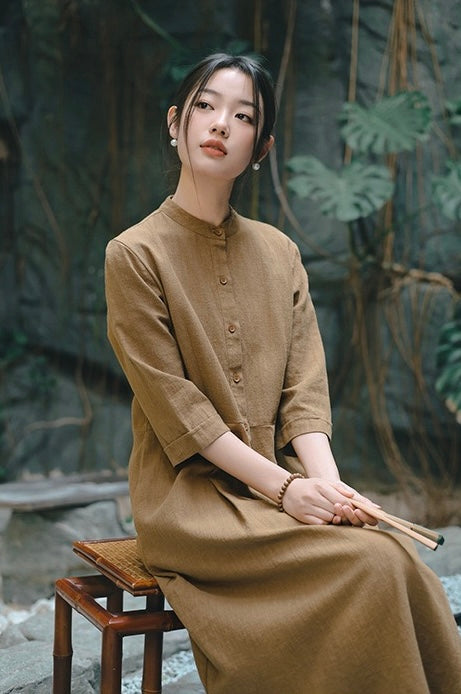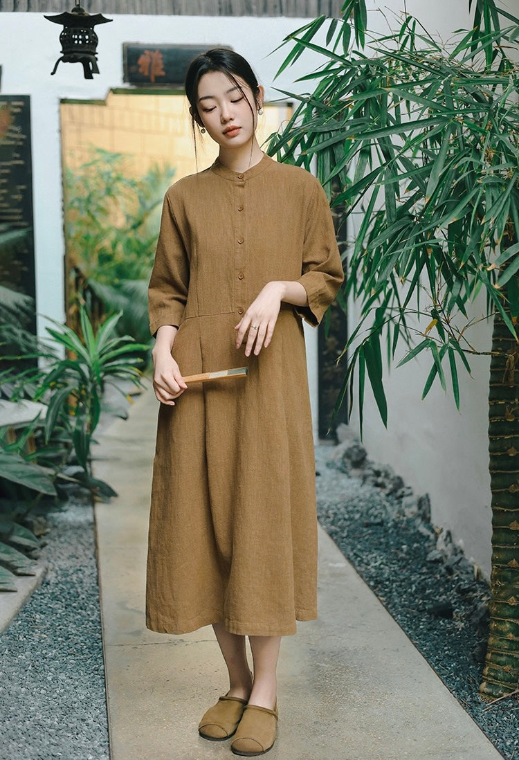 In the quiet morning light, a cup of rich bronze-hued tea sits beside you, its warmth mirroring the gentle embrace of sand-washed ramie cotton against your skin. This is more than a dress—it is a moment, a presence, a story woven in threads of time and tradition.