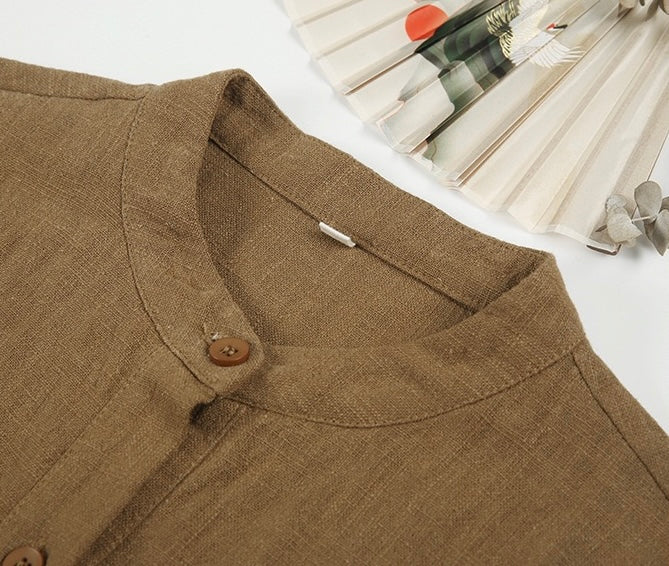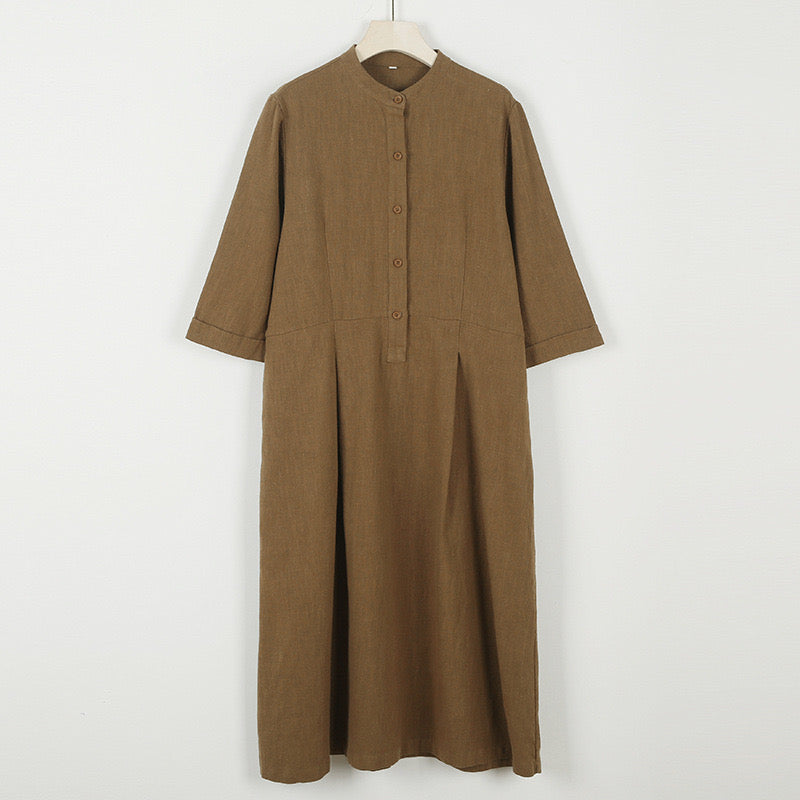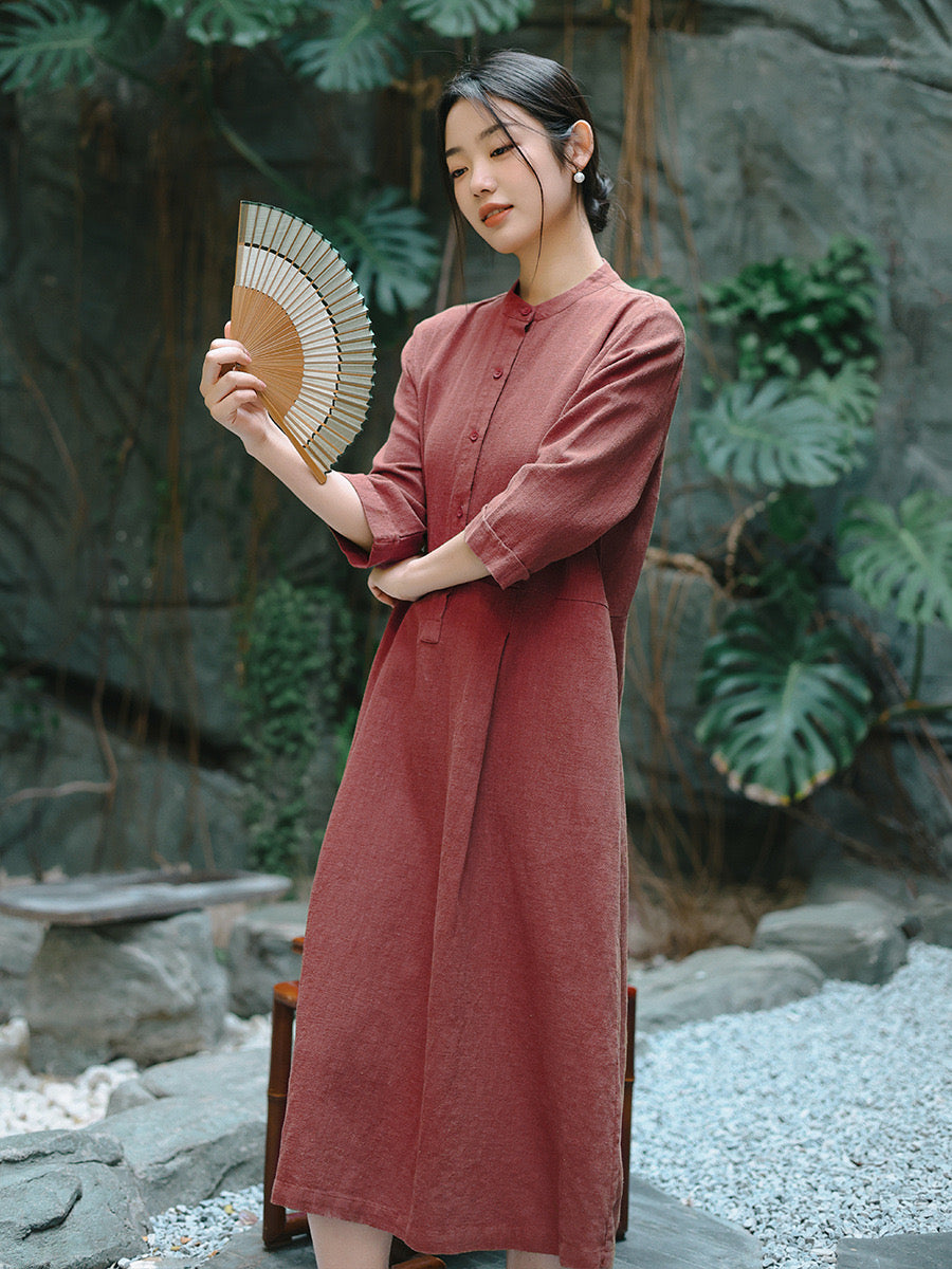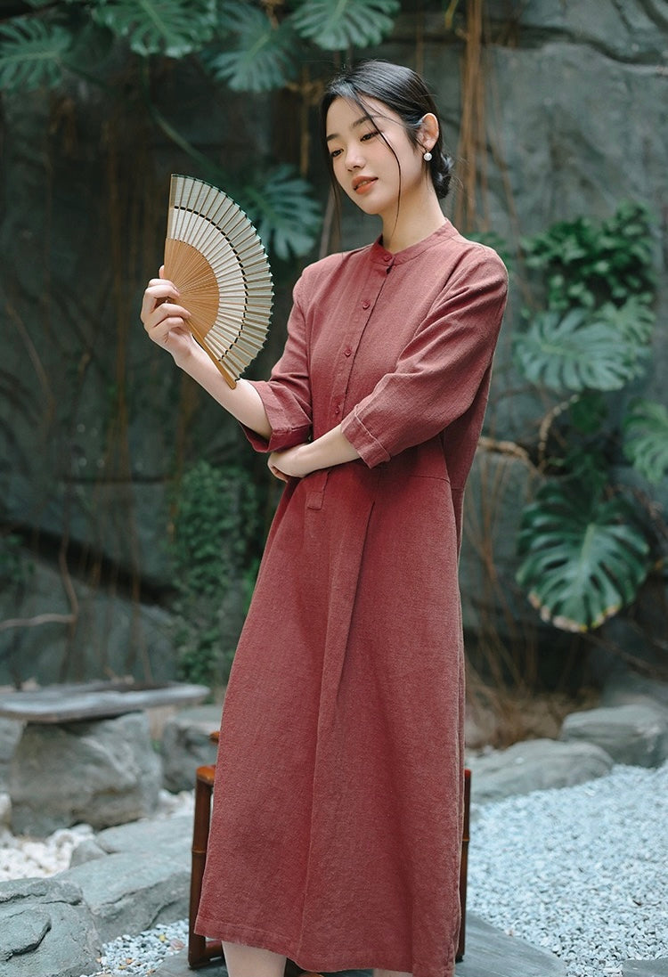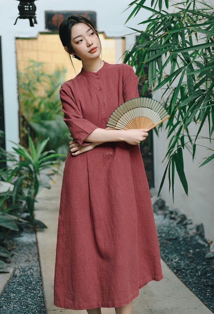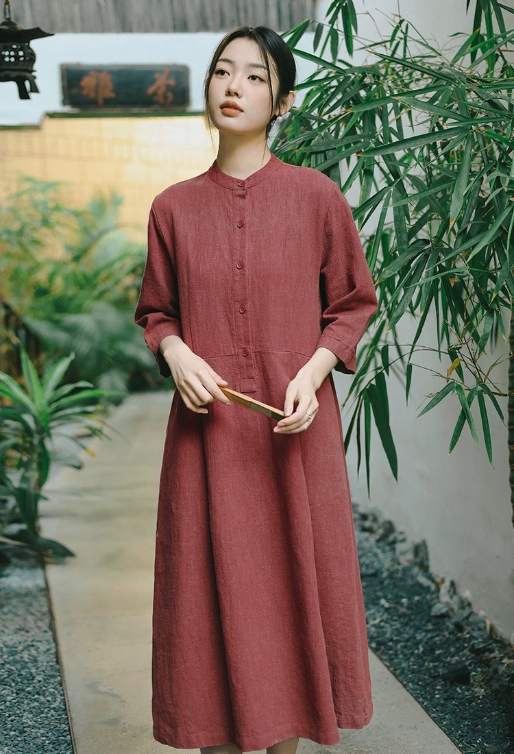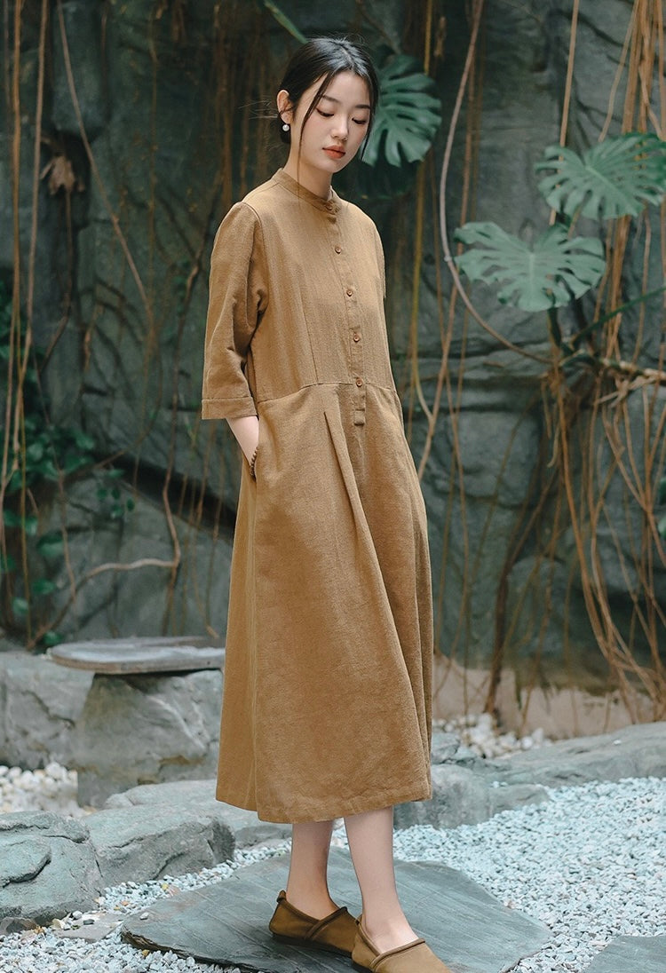 In the quiet morning light, a cup of rich bronze-hued tea sits beside you, its warmth mirroring the gentle embrace of sand-washed ramie cotton against your skin. This is more than a dress—it is a moment, a presence, a story woven in threads of time and tradition.