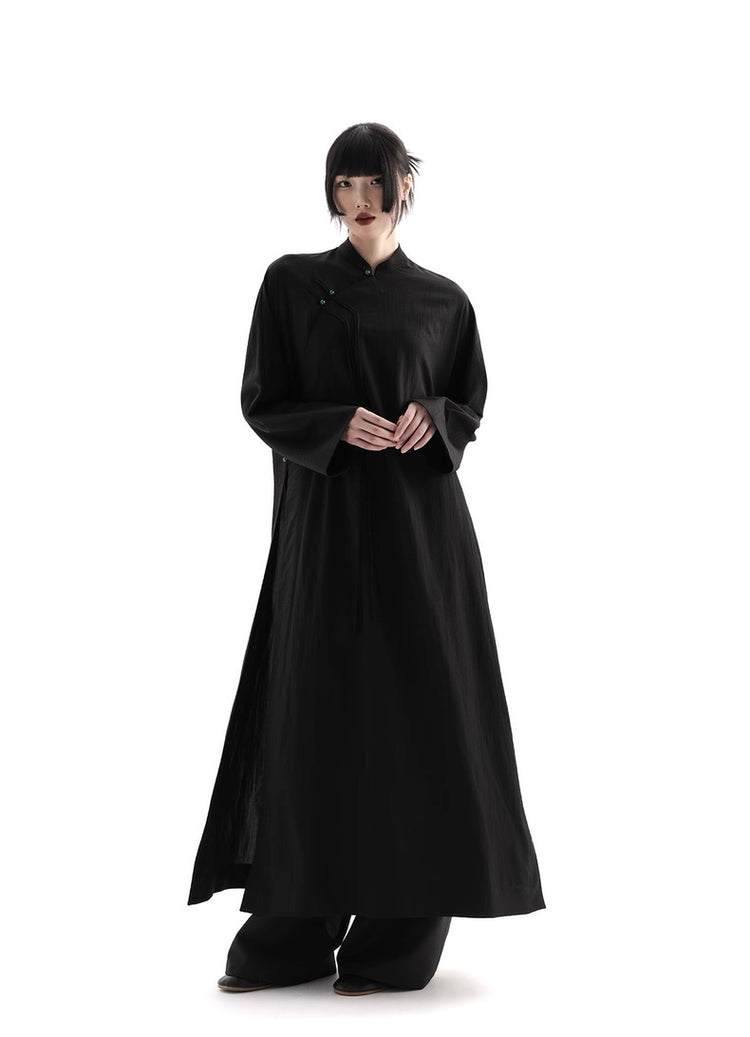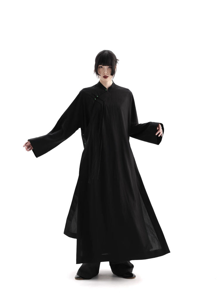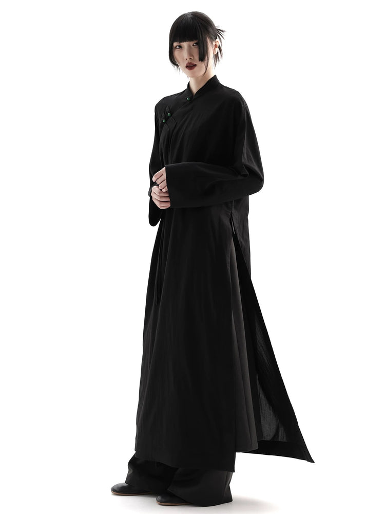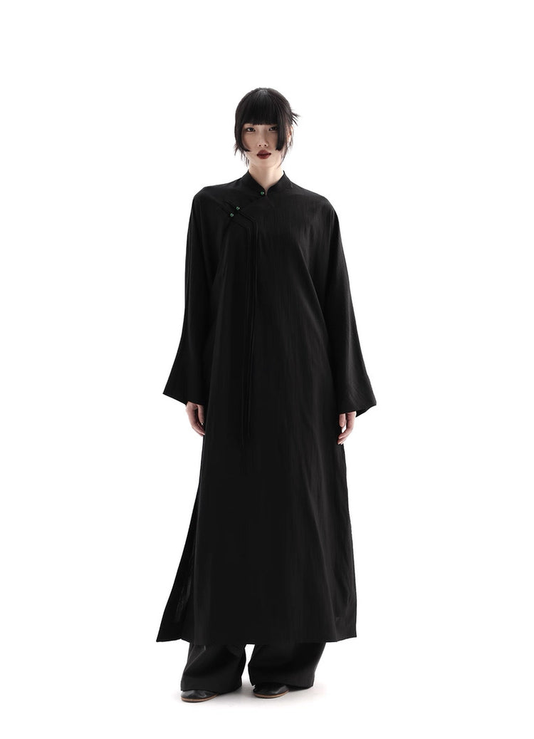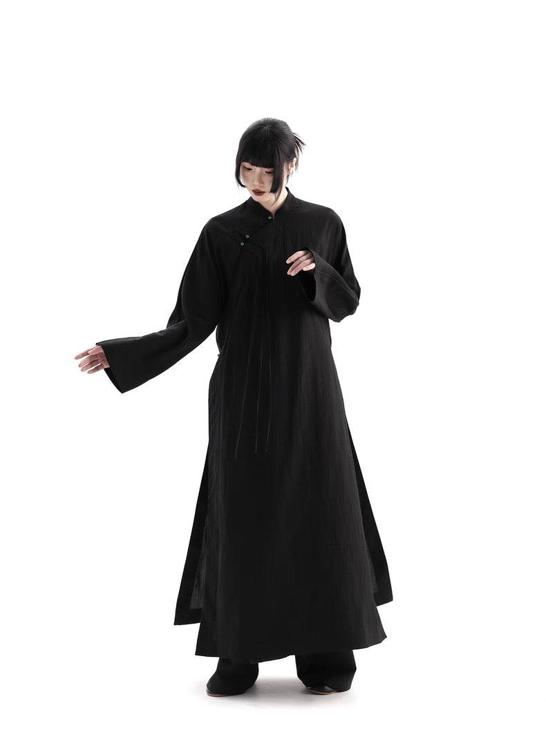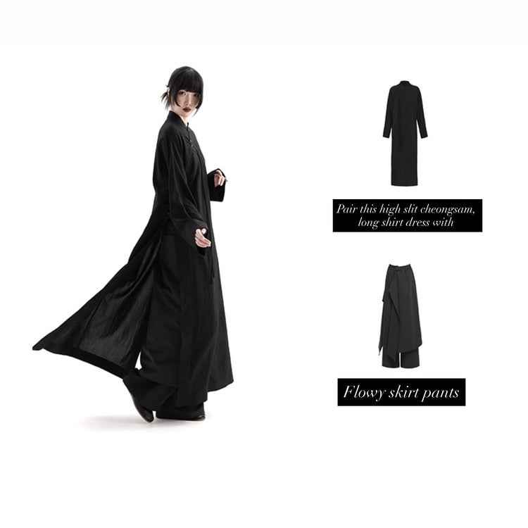 This cheongsam, a long shirt dress with high slits, pairs effortlessly with flowy skirt pants — allowing qi to circulate freely through every movement.