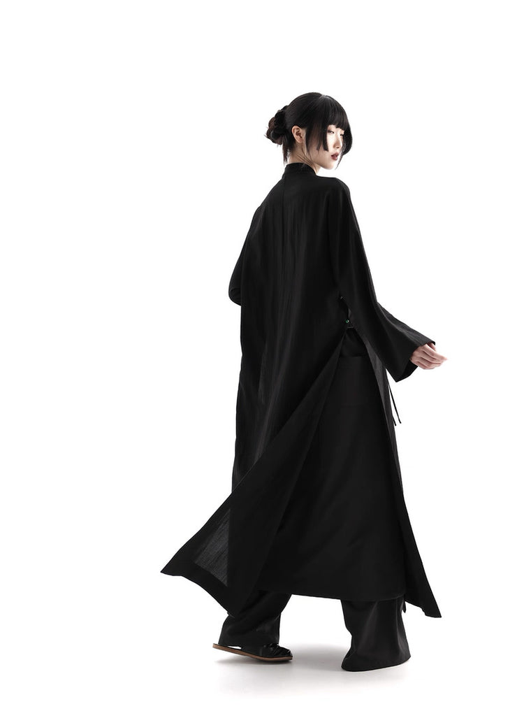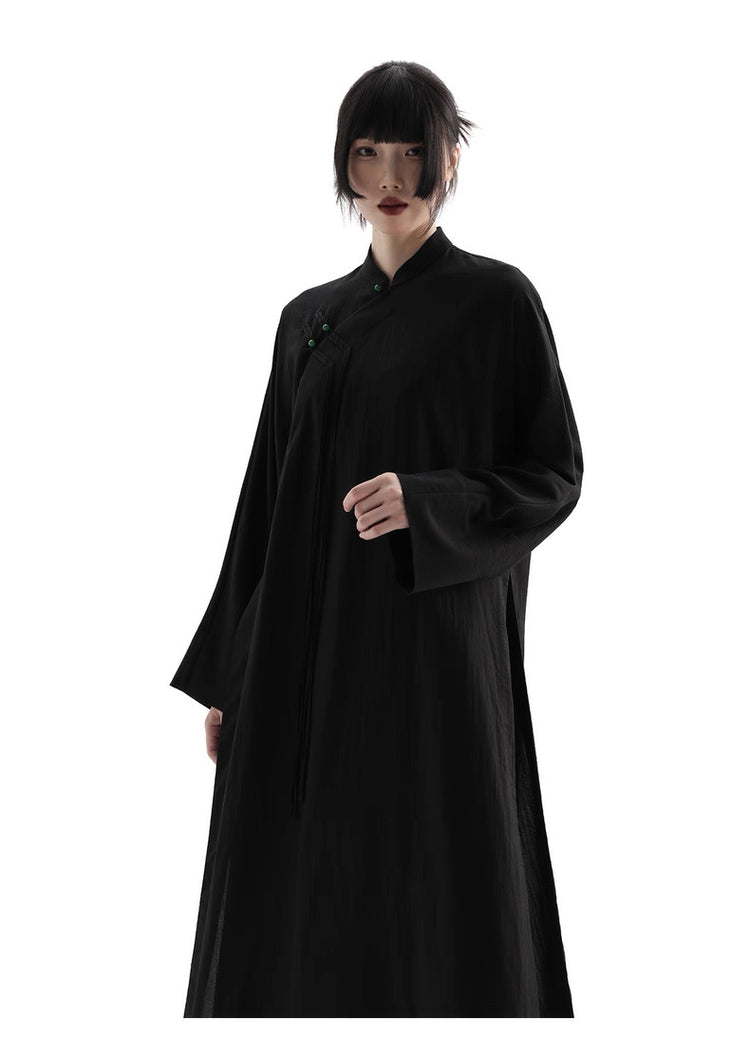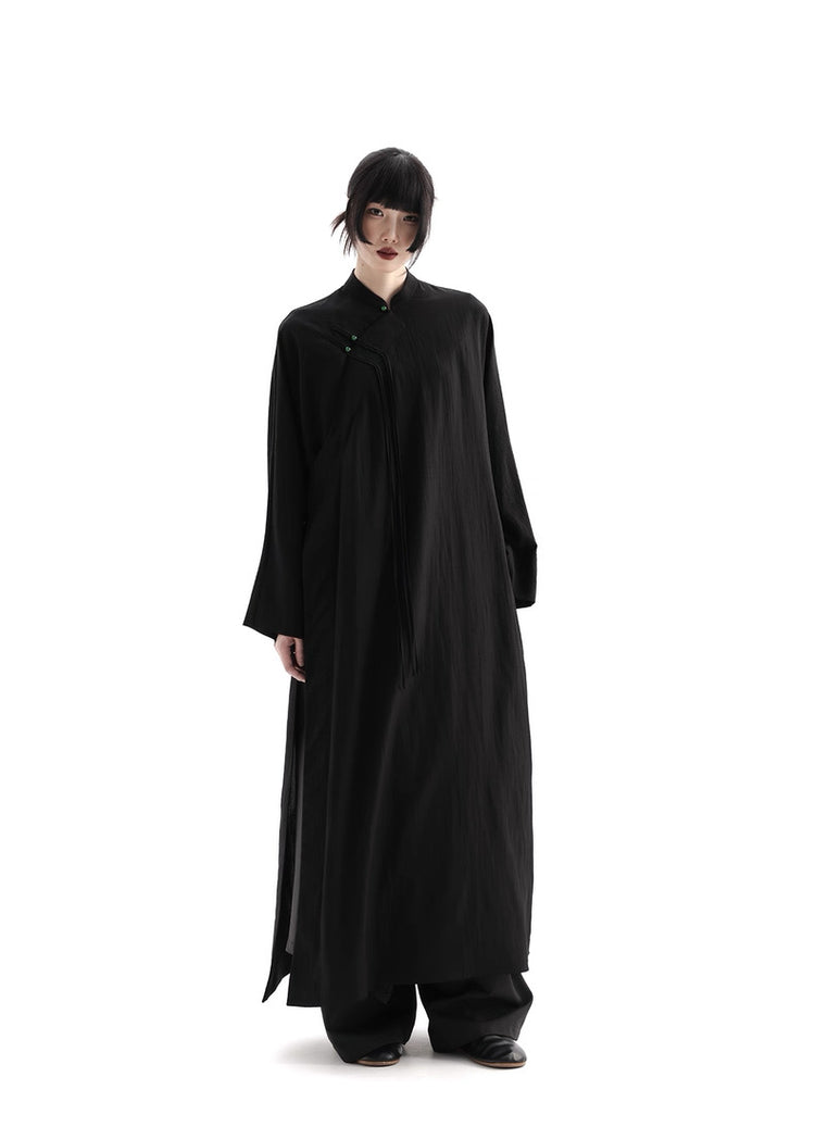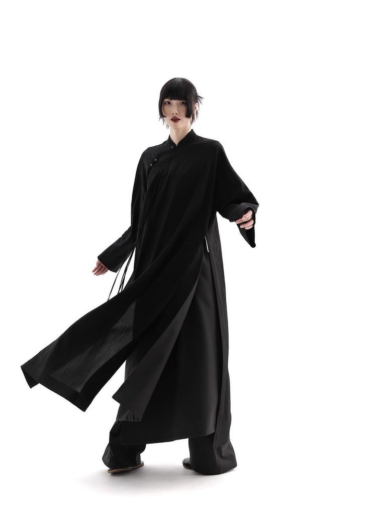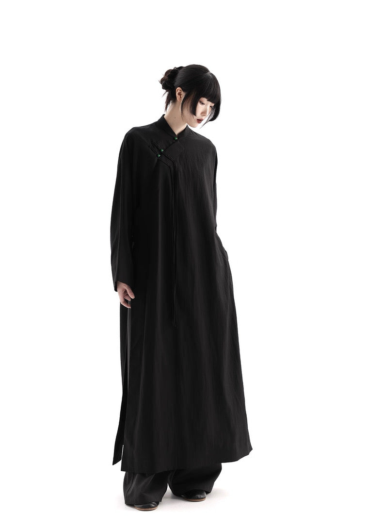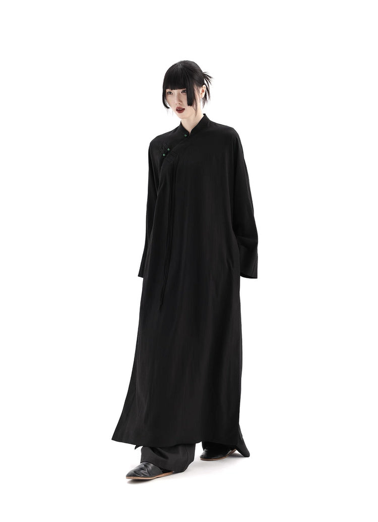 This cheongsam, a long shirt dress with high slits, pairs effortlessly with flowy skirt pants — allowing qi to circulate freely through every movement.