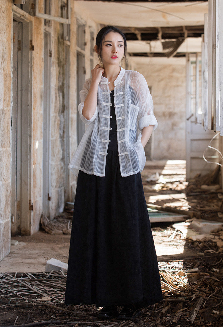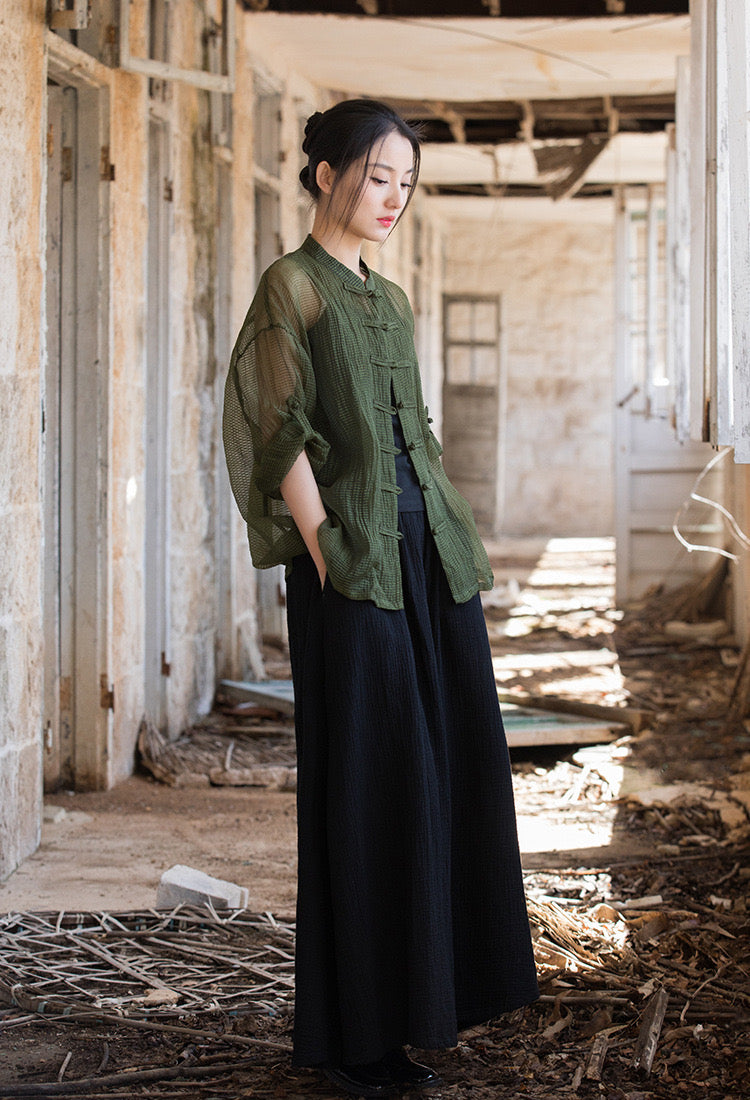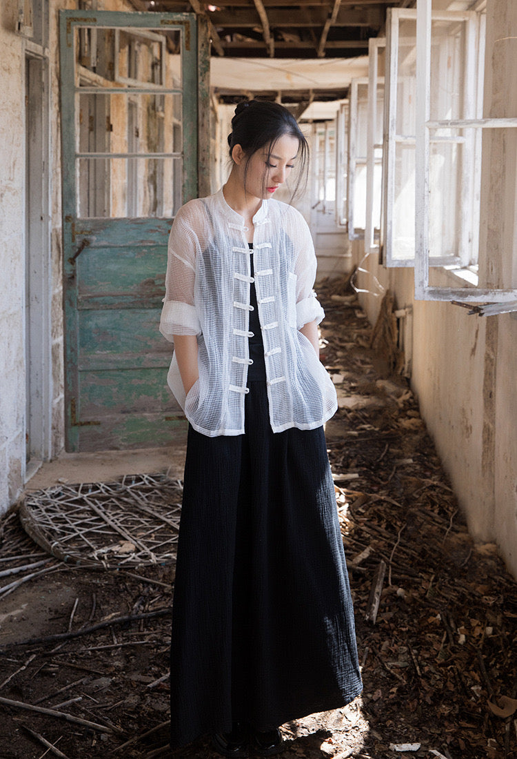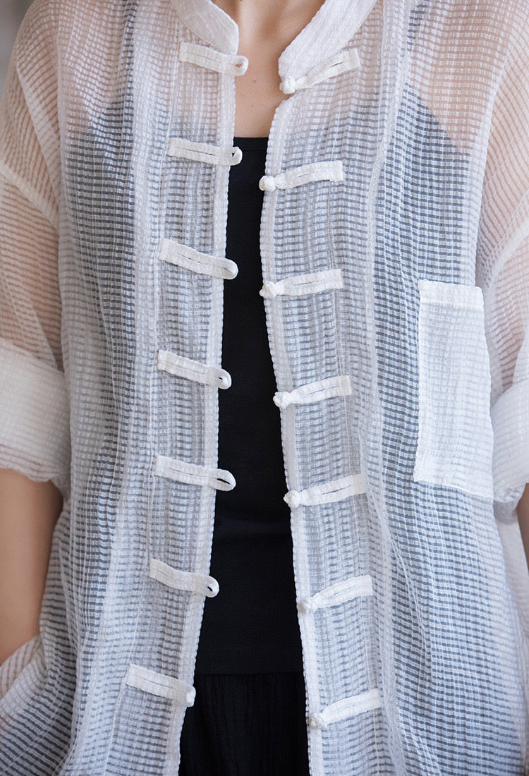 The unique 7 pearl-like gongfu button buckles represents the 7 stars and 5 elements, making this Zen and Dao top a must-have for ultimate energy flow state this summer. Durable, lightweight and stylish — the perfect combination for yin-yang flow and elegance. Available in two colours, jade green and white to uplift your aura and new zen closet.