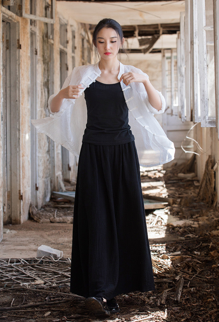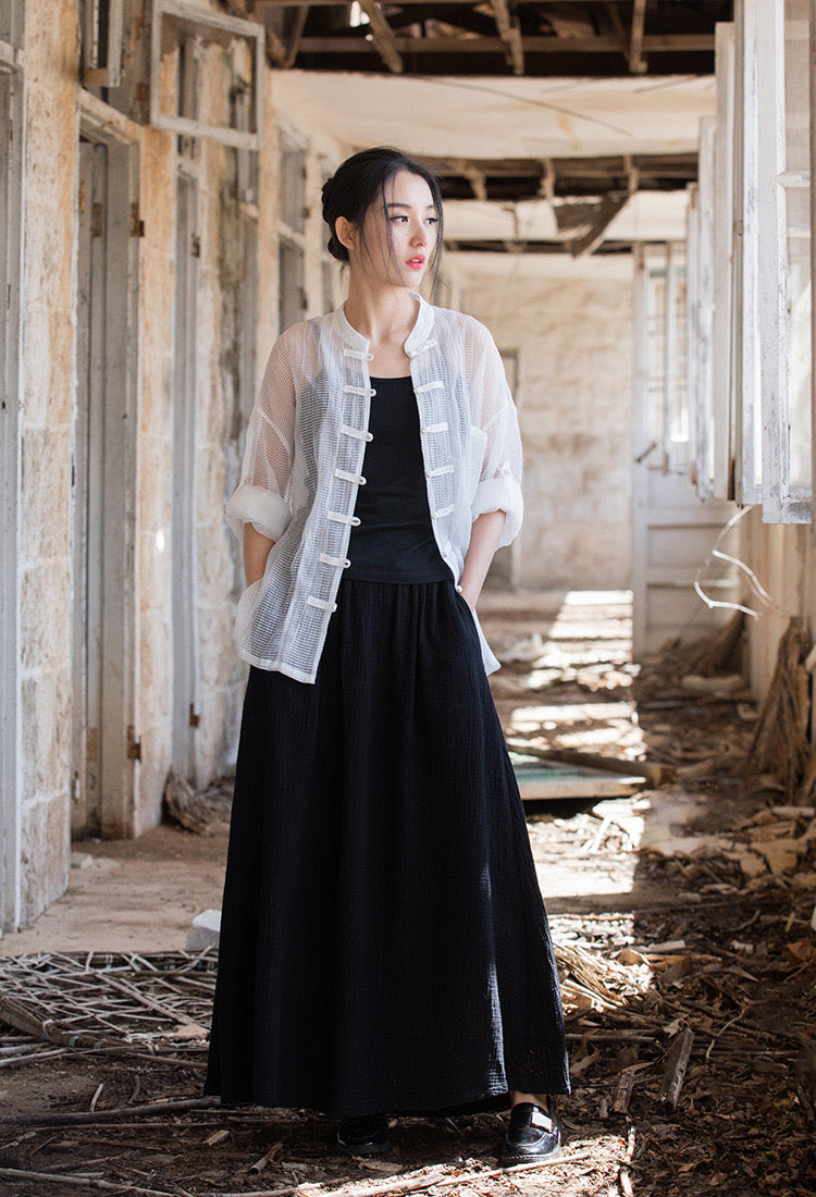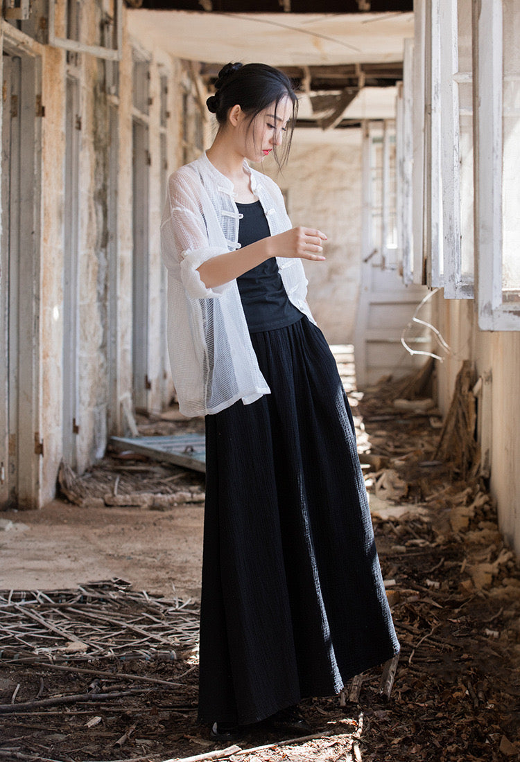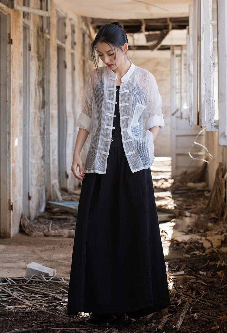 The elegant translucent lyocell brocade pattern adds an elegant touch to dress up and down. Perfect for summer as a shirt, as a jacket layer with your dresses, and as a jacket cardigan layering for all new earth seasons. Pair this top with the matching skirt for a timeless look. Check out The Dao 道 of Zen Skirt Skirt, in black and white.