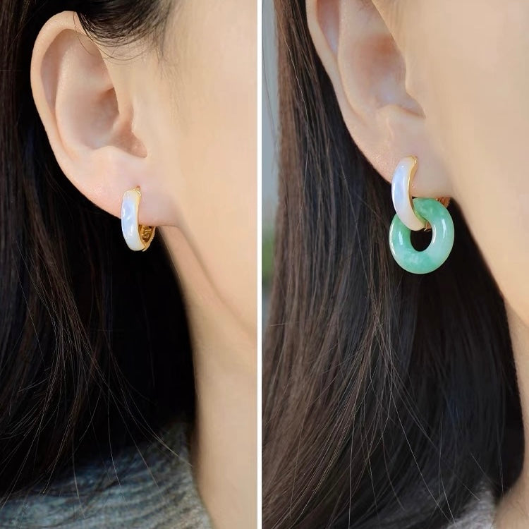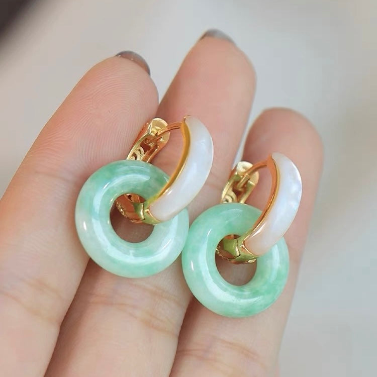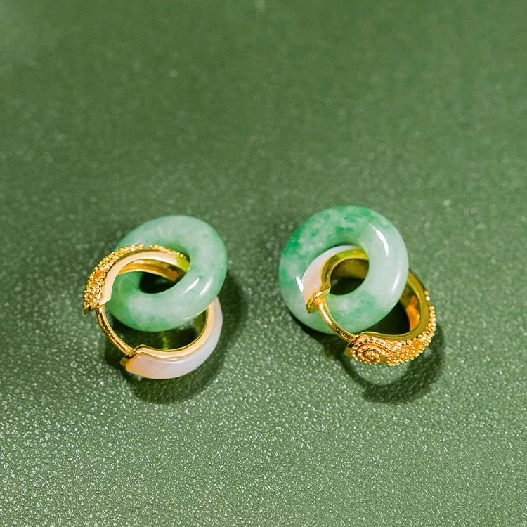 Tao Jade Tech™ • Double Jade Safety Buckle Earrings • Green and White Jade • 14k Gold Plated • High Jade Grade • High Vibrational Frequency